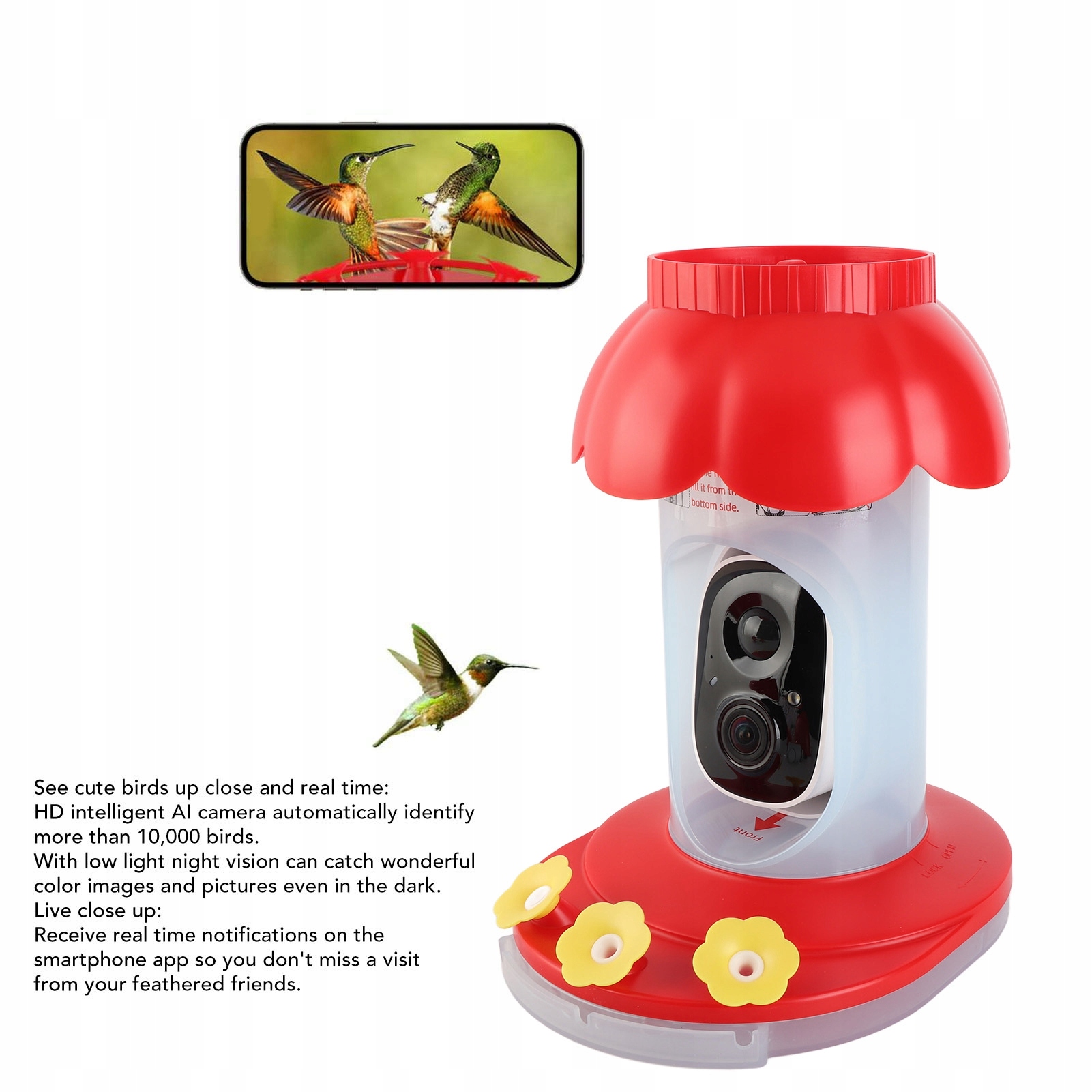 1. СПОСТЕРЕЖЕННЯ ЗА ПТАХАМИ В РЕАЛЬНОМУ ЧАСІ: розумна камера для годування птахів із камерою HD AI може автоматично ідентифікувати понад 10 000 видів птахів для перегляду зблизька. Отримуйте сповіщення в режимі реального часу на свій смартфон, щоб ніколи не пропустити візит пернатих друзів.