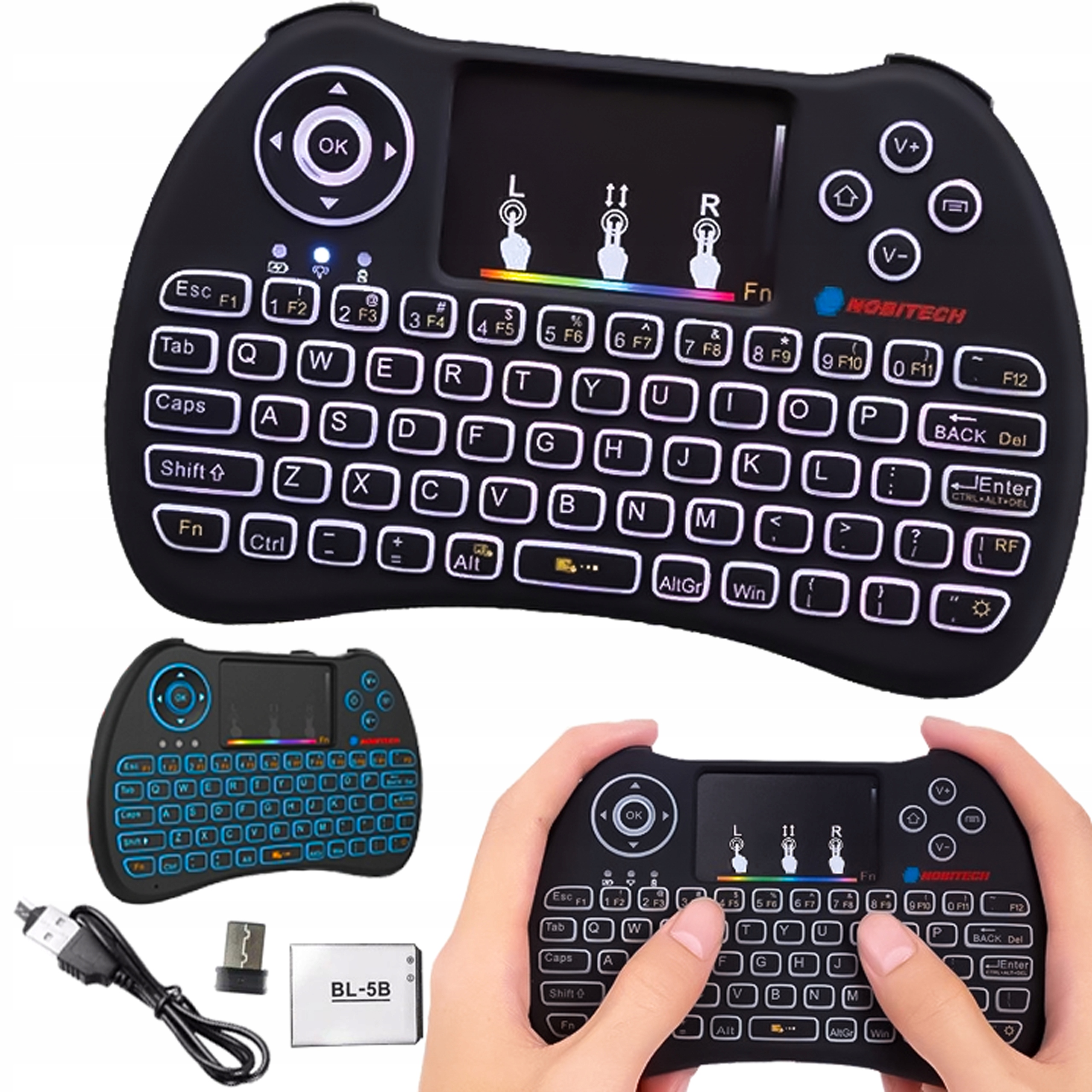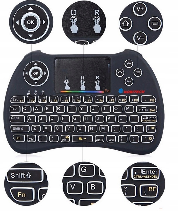 Високоякісна бездротова клавіатура з підсвічуванням, яку можна використовувати, зокрема, для: Smart TV, Android TV BOX, комп’ютер або консоль (Xbox 360, PS3). Завдяки невеликому розміру і підсвічуванню клавіш (підсвічування можна вмикати і вимикати) забезпечує високу якість використання. Клавіатура виконана з приємного матеріалу і надійно лежить в руці. Він має систему SLEEP MODE, щоб заощадити енергію, клавіатура переходить у сплячий режим після 3 хвилин невикористання, натискання будь-якої клавіші зробить клавіатуру знову готовою до роботи. Завдяки вбудованій СЕНСОРНІЙ ПЕДАХІклавіатура також служить повнофункціональною мишею!