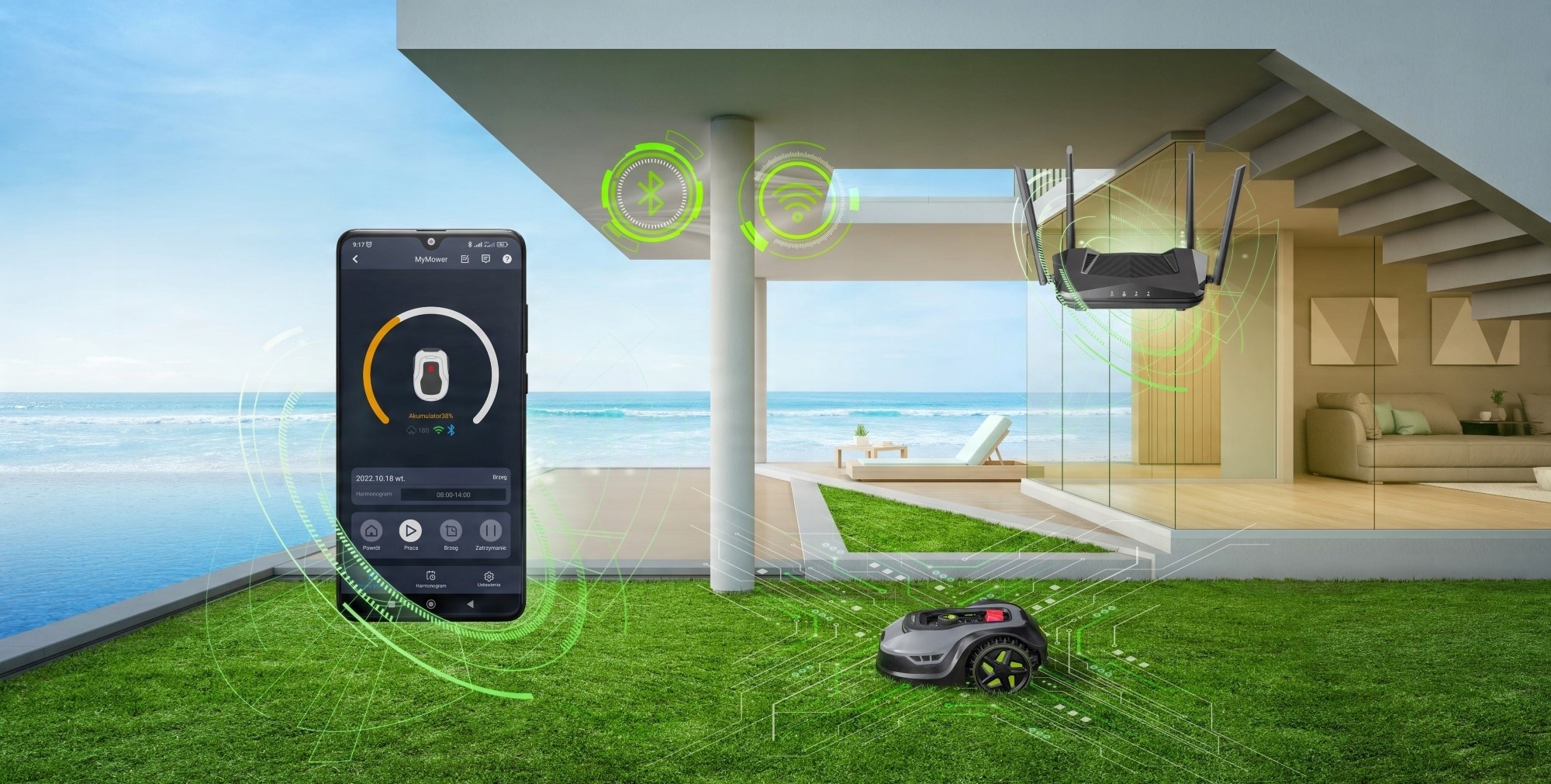- Функція скошування краю спрямовує косарного робота вздовж обмежувального дроту та дозволяє підтримувати відповідну довжину траву також по краях вашого газону. На рівні програми ми можемо налаштувати частоту косіння краю відповідно до тижневого робочого графіка пристрою.