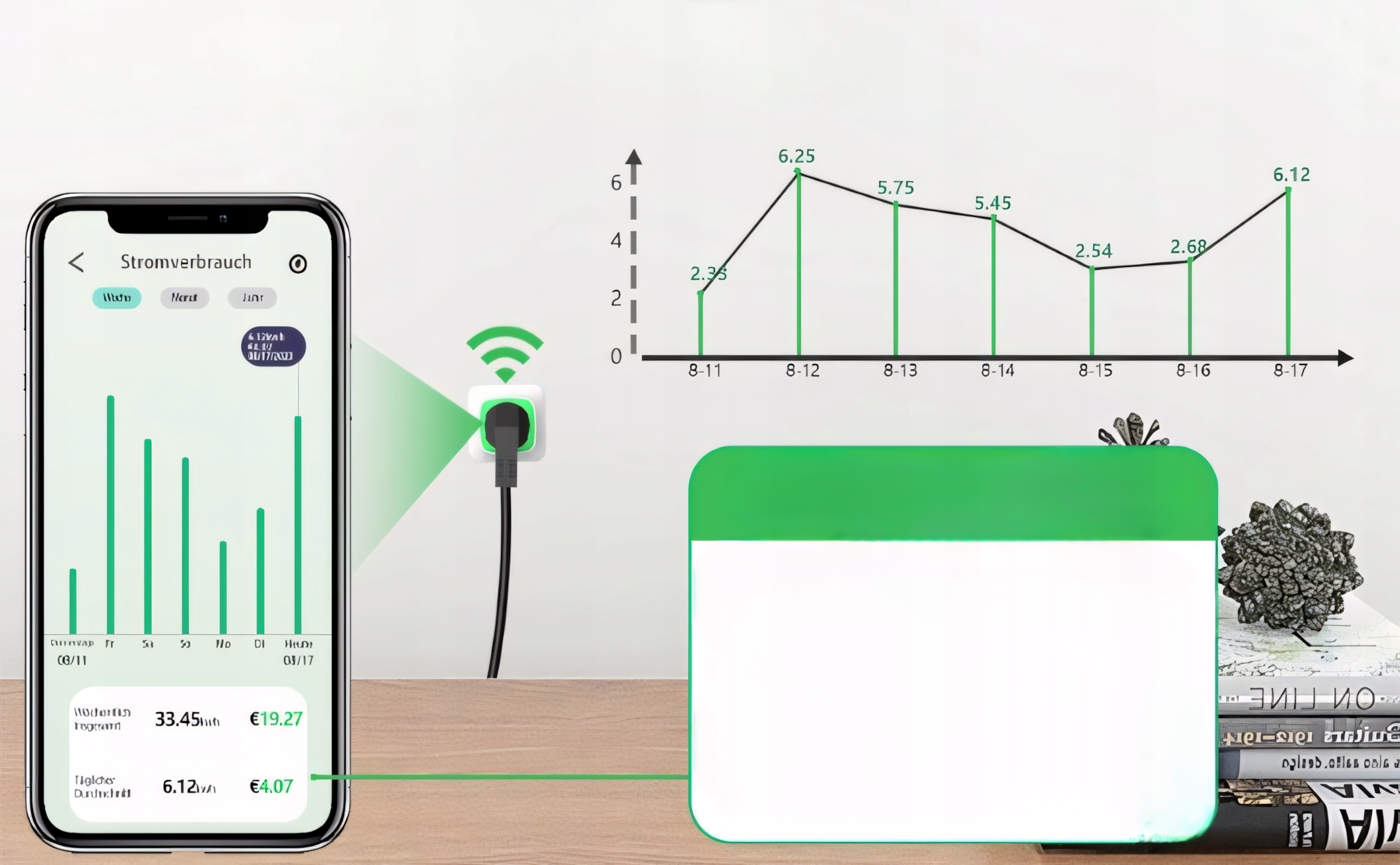 Розетка SURFOU WLAN оснащена функціями вимірювання споживання енергії та прогнозування вартості, що дозволяє точно відстежувати та керувати споживанням електроенергії . Завдяки вбудованому лічильнику енергії програма VeSync відображає всі важливі дані, такі як поточне споживання енергії та приблизні витрати, у розбірливому та зрозумілому вигляді. Ви можете легко відстежувати, скільки енергії споживають підключені пристрої та як це впливає на ваші рахунки за електроенергію. Цей інструмент дозволяє ефективно керувати споживанням енергії, що допомагає зменшити рахунки за електроенергію та заощадити енергію у вашому домі.