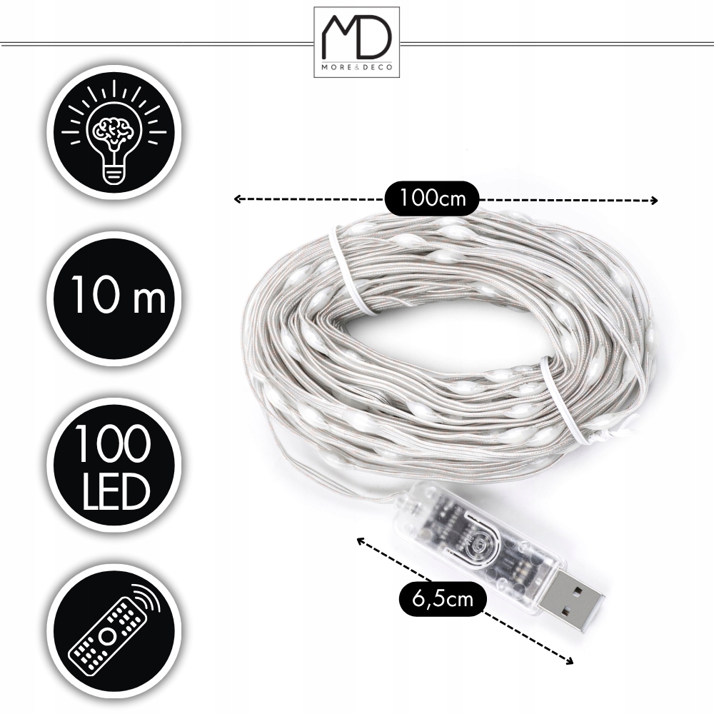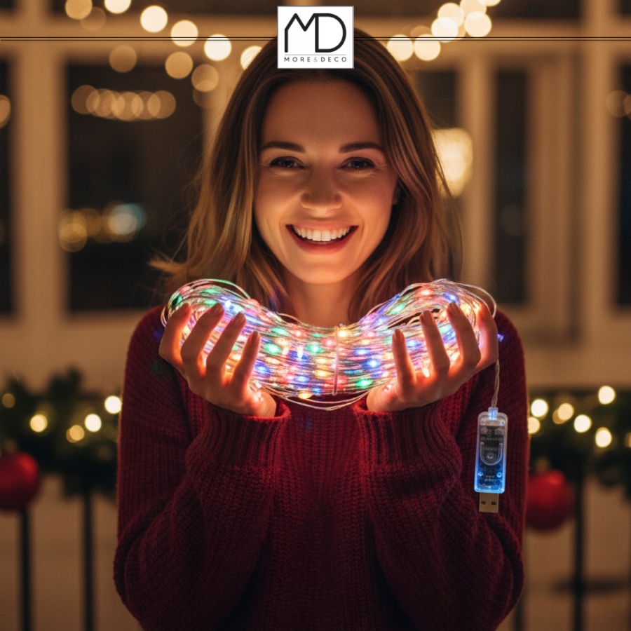 ✨ Лампи More&Deco SMART LED 100 - це ідеальне поєднання сучасного стилю, функціональності та простоти. Завдяки пульту дистанційного керування ви можете змінювати кольори, яскравість і режими освітлення всього за кілька секунд, створюючи неповторну атмосферу - від різдвяної магії до романтичного сяйва.