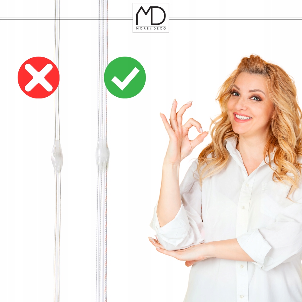 На відміну від ніжних дротів, які легко ламаються, лампи More&Deco оснащені хорошим товстим дротом високої міцності. Усередині потрійний дріт, закріплений прозорою ізоляцією, яка захищає від стирання та забезпечує безпечне використання протягом багатьох сезонів.