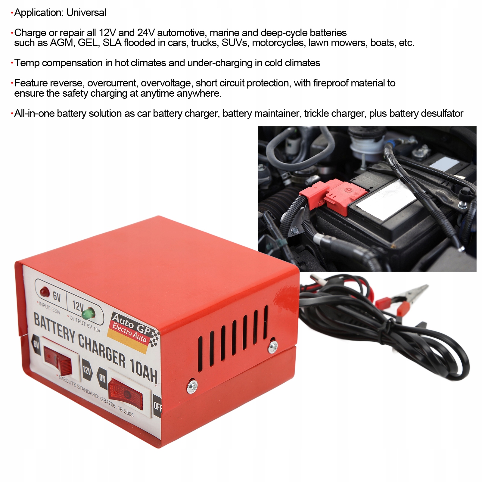 1. Потужна функція: швидкий зарядний пристрій може заряджати або ремонтувати всі автомобільні, морські та глибокі батареї на 12 В і 24 В, такі як AGM, GEL, SLA, залиті в автомобілях, вантажівках, позашляховиках, мотоциклах, газонокосарках, одязі тощо.