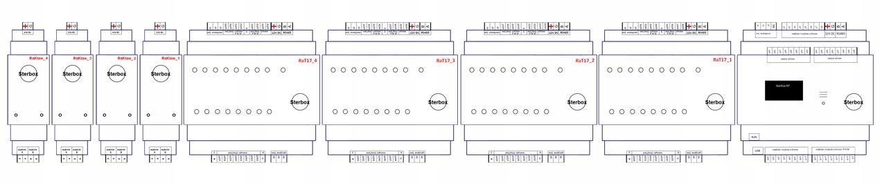 Для керування ланцюгами 230В (лампочки, ролети, жалюзі, вентилі, гаражні ворота, в'їзні ворота тощо) необхідно підключити зовнішні реле. Контролер повинен бути оснащений джерелом живлення 12 В з потужністю, що відповідає кількості підключених модулів і реле