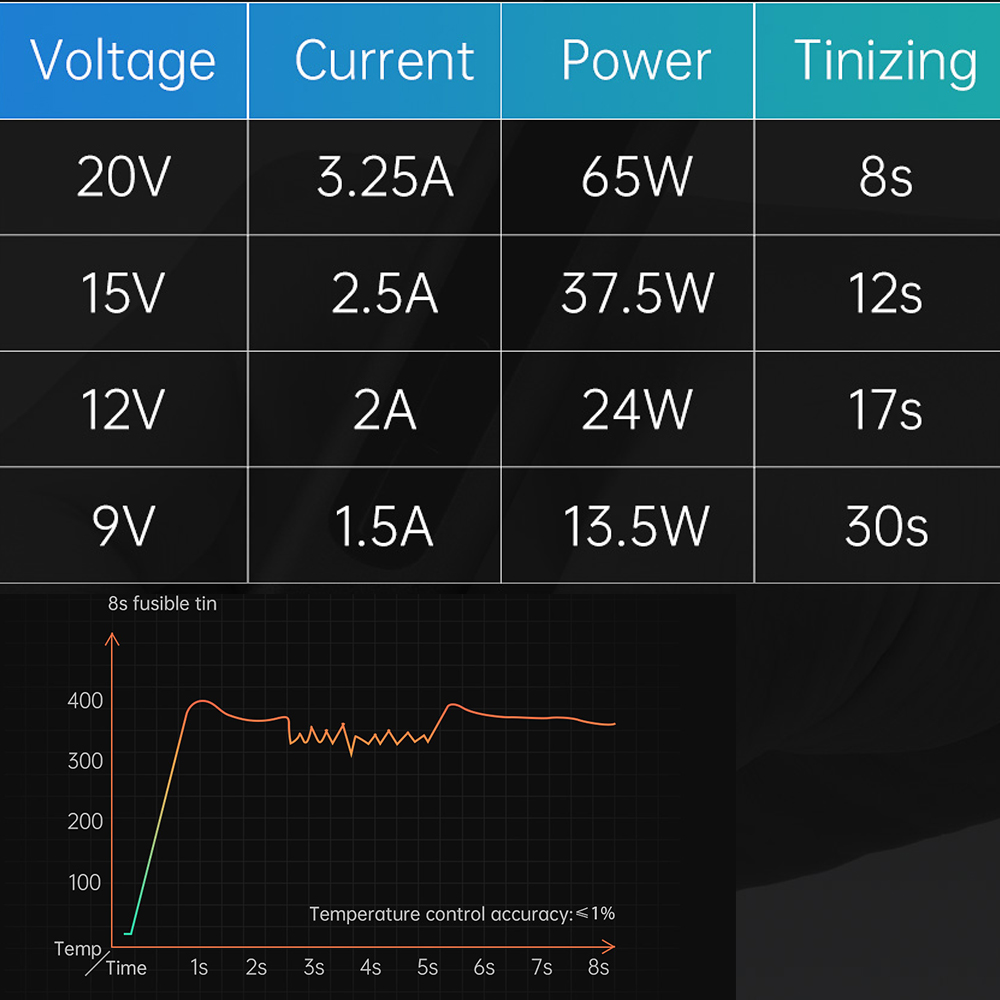 Цей розумний паяльник має OLED-дисплей, а внутрішня конструкція нагрівальної частини та керамічного нагрівального сердечника, які можуть забезпечити достатню кількість енергії для нагріву та кращу теплопровідність для забезпечення швидкого нагріву за 8 с, можуть відповідати багатьом сценаріям використання. Сумісний із протоколами Quickcharge 3.0 і PD 2.0, з низьким енергоспоживанням і залежністю від протоколу та підтримкою режиму живлення постійного струму.