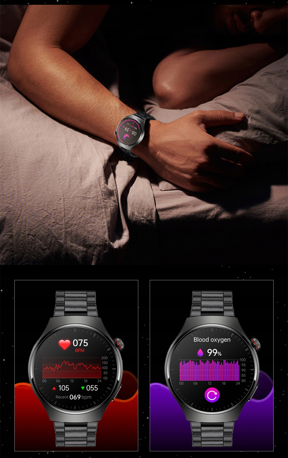 Годинник оснащений оптичним датчиком, який дозволяє вимірювати частоту серцевих скорочень, артеріальний тиск, оксигенацію крові та температуру.