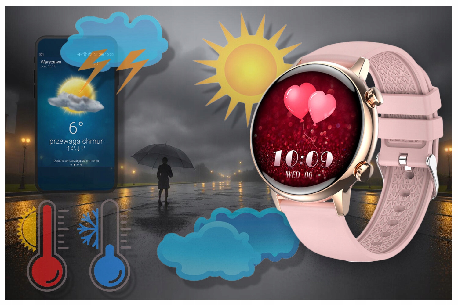 Після підключення до програми розумний годинник відображає дані про погоду. Тепер все, що вам потрібно, це один погляд на розумний годинник, і ви вже знаєте, яка погода буде найближчим часом. Завдяки погоді у вашому розумному годиннику ви можете краще планувати свою діяльність і одягатися відповідно до навколишньої погоди!