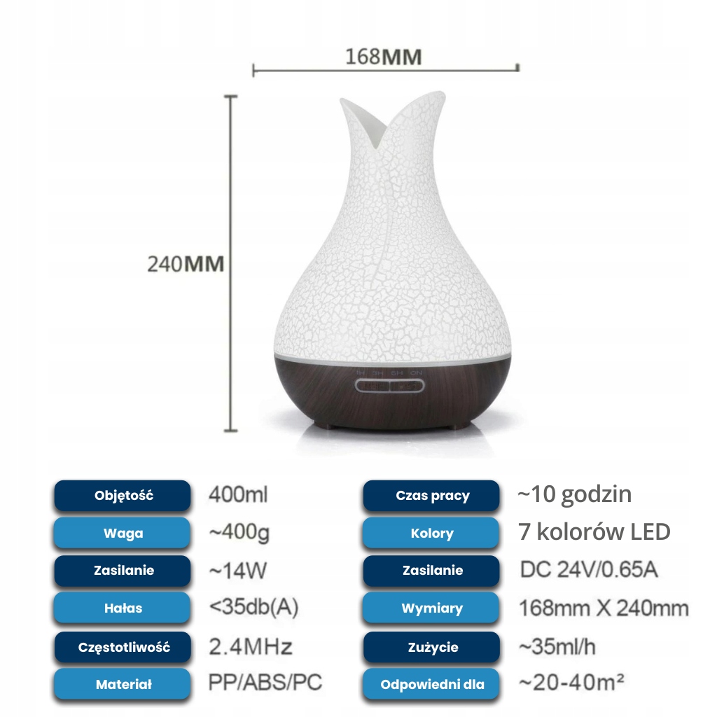 Дифузор використовує ультразвукову дифузійну технологію для розпилення ефірних масел у приміщенні. Інтелектуальний дифузор працює, виробляючи 360 ° ультразвукові частоти, які негайно розпорошують молекули води та олій у повітрі. Результат - набагато здоровіша альтернатива, ніж старі термічні дифузори, які можуть пошкодити ефірні олії під час процесу дифузії тепла. Це зручно і вимикається автоматично, коли танк порожній.