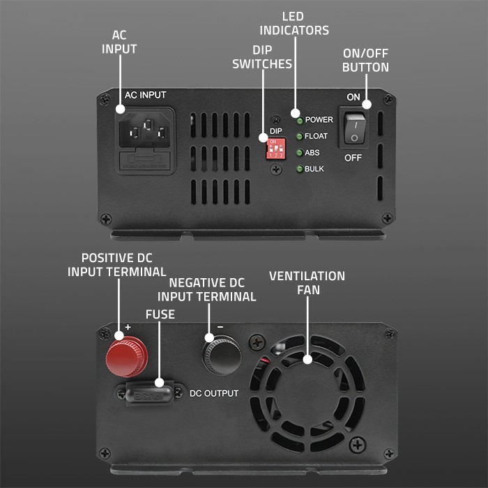 - Примітки: Зарядний пристрій призначений лише для акумуляторів на 12 В переконайтеся, що кабелі правильно підібрано для батарей. Перш ніж розбирати батарею, спочатку вимкніть усі навантаження, а потім від’єднайте її від ланцюга. Використовуйте лише акумуляторні батареї. Ніколи не намагайтеся зарядити замерзлу або пошкоджену батарею!