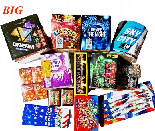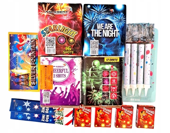 Набір складається з 30 елементів, 8 батарейок 20 мм. 4 x Фонтан для торта 18 см 60 секунд, 4 x Фонтан для торта 40 секунд, 3 x Дзиги, 6 x Дияволи, Великі дияволи, Зовнішні фонтани, 4 x бенгальські вогні, 4 x нитки, римські бенгальські вогні 10 пострілів 10 штук,