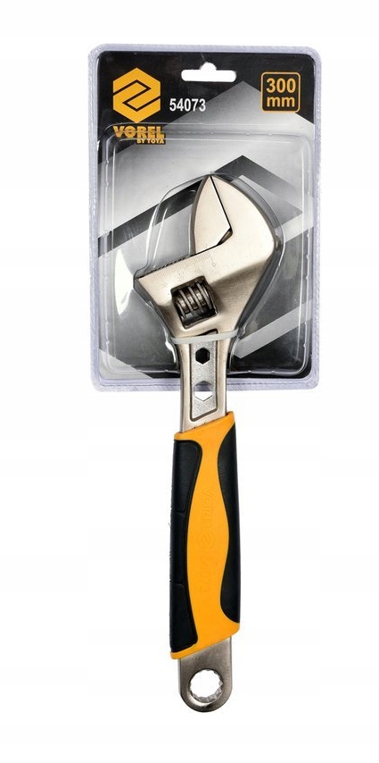 Ключ розвідний 300 мм фірми Vorel 54073. Виготовлений з вуглецевої сталі, кований. Поверхня ключа нікельована. Ручка виготовлена з пластику.