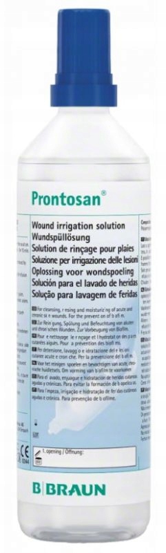 4 У випадку інших ран, окрім серйозних та гострих ран, промивання достатньо. У випадку ран, що покривають великі ділянки, а також тверді до -прочитані рани, рекомендується зволожувати рану пронтозанським розчином протягом принаймні 15 хвилин, використовуючи для цієї мети просочений компрес. Розчин слід використовувати в нерозведеному вигляді.