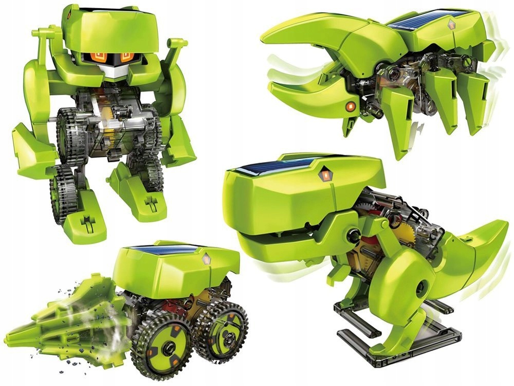 - Сонячний динозавр для самостійного складання. Після складання іграшка живиться від сонячного світла, що є екологічним і безпечним для батьків кишеньковий (не потребує використання стандартних батарейок). Іграшка дозволить маленькому любителю саморобки розвинути креативність, терпіння та акуратність, що, безсумнівно, позитивно вплине на розвиток дитини, а значить що ми можемо зібрати аж 4 різні моделі: - динозавр, - робот, - свердлильний верстат - комаха