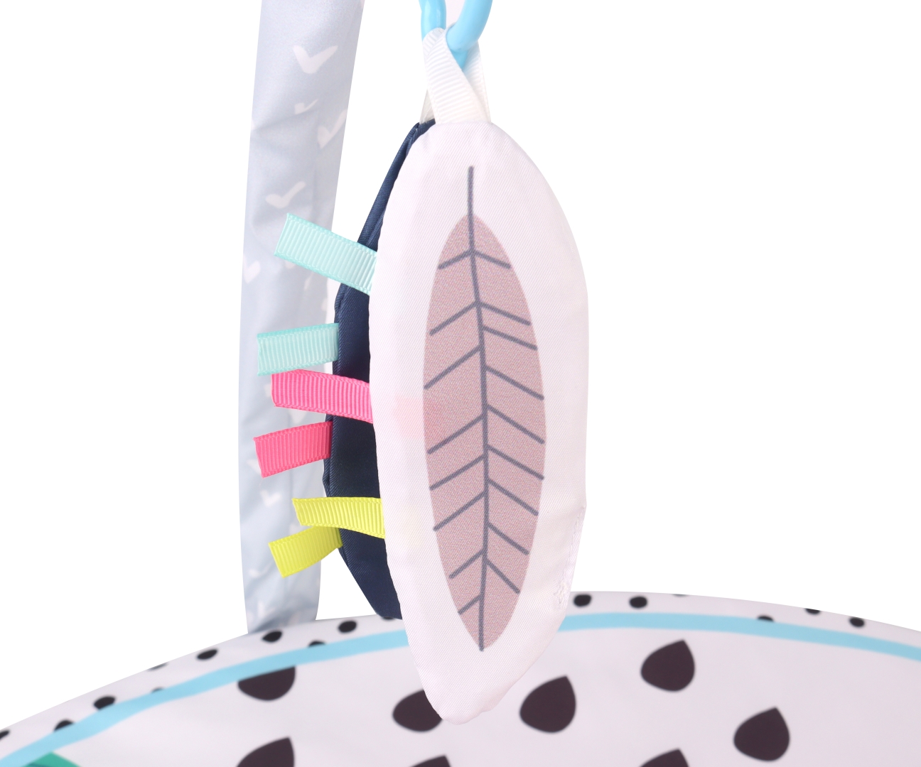 М'який, круглий килимок із зручним місцем для лежання, перегортання та спостереження. Дві ручки з підвісками заохочують до виконання вправ рук і хвата, а також стимулюють зір і слух.
