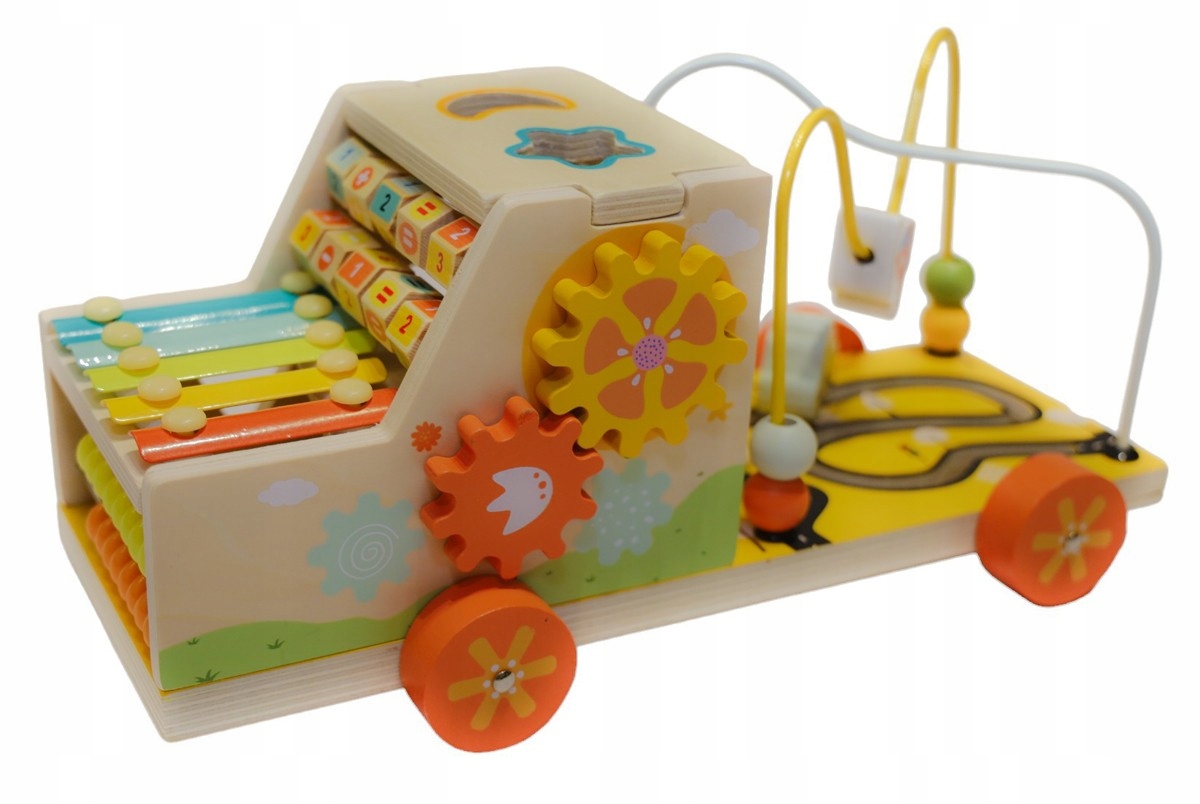 - Розвиваюча іграшка: містить 7 навчальних ігрових елементів, зокрема іграшковий автомобіль, рахівницю, два типи лабіринтів, головоломку, математичний циліндр і сортувальник форм.