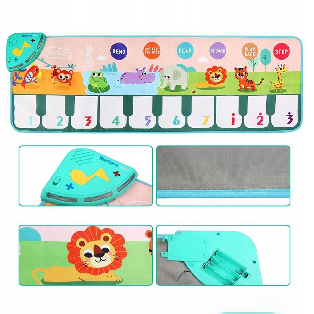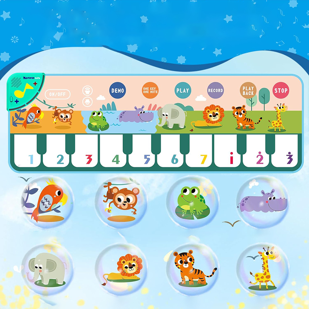 Цей музичний килимок для піаніно має 10 функціональних клавіш піаніно. Грайте на різних клавішах, щоб вивчити інший темп і ритм. Цей килимок для піаніно для малюків складається з 8 типів звуків тварин (папуга, мавпа, жаба, бегемот, слон, лев, тигр, жираф). Ви також можете налаштувати гучність відповідно до вашої дитини, торкнувшись клавіші гучності.