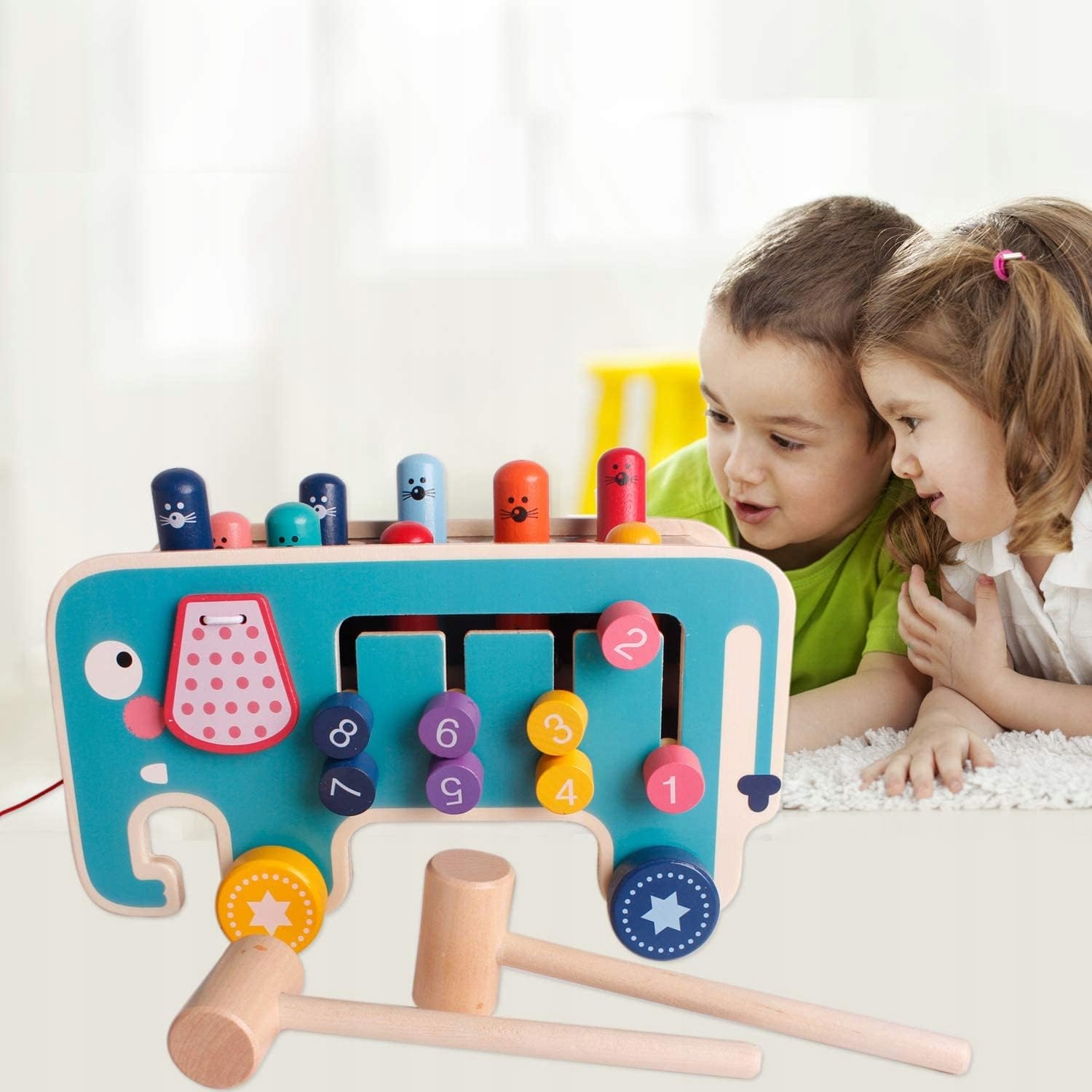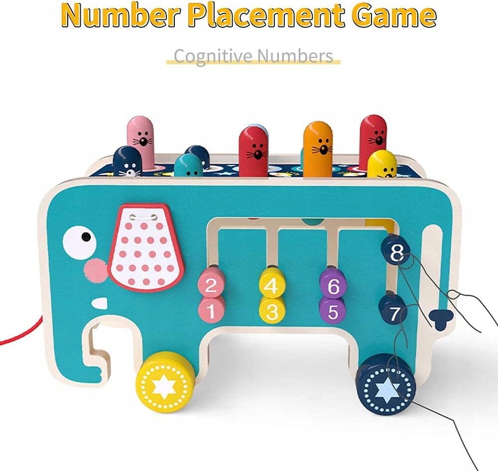 Іграшка, створена з увагою до деталей, має максимум 10 стовпчиків і 2 молотки, що дозволяє грати разом з братами і сестрами, друзями чи батьками. Різноманітні елементи, такі як зірочки, вогники, мишки, слоники, пончики та цифри, розташовані в автобусі, приносять дітям багато радості та дозволяють їм вивільнити зайву енергію через взаємодію.