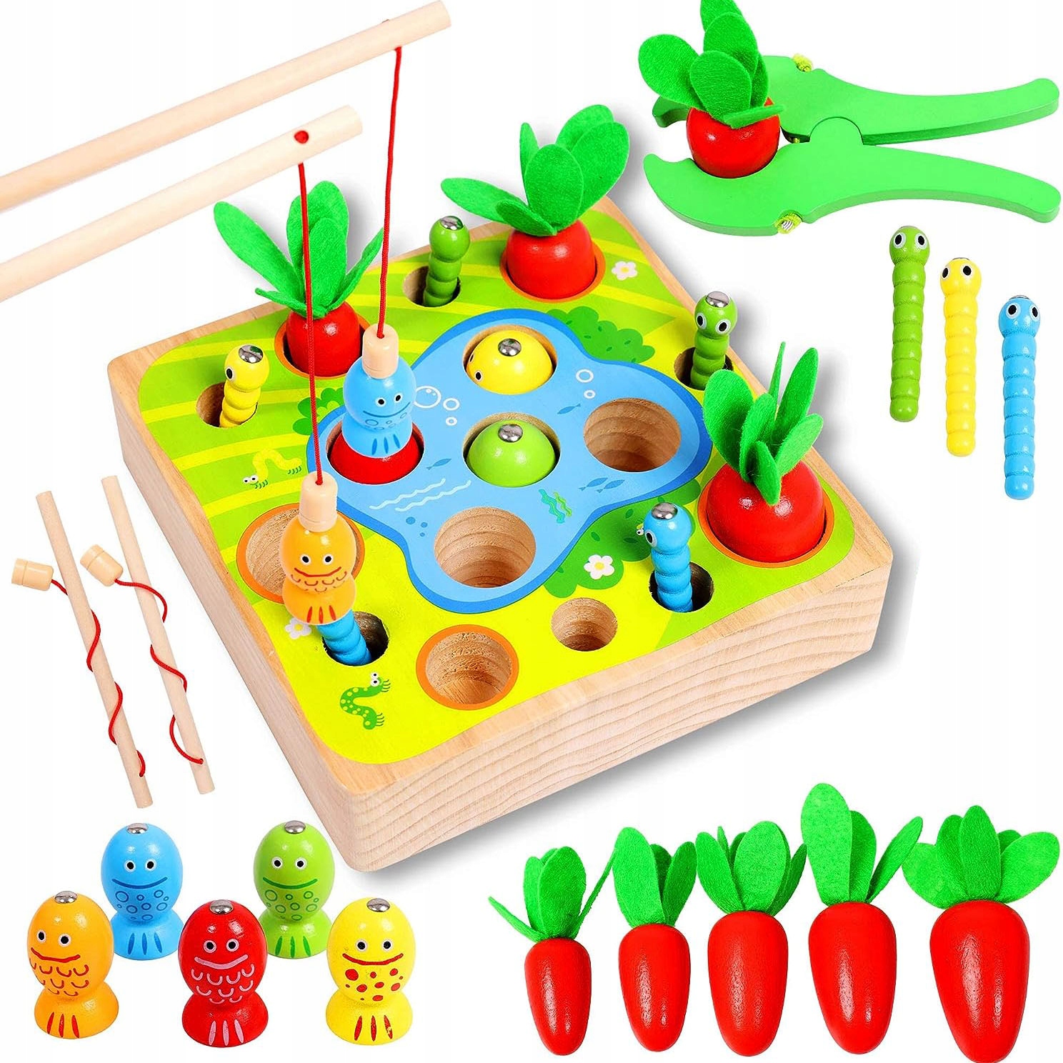 🥕В комплект поставки входить: 1 дерев'яна тумба, 5 морквин, 6 черв'яків, 5 рибок, 2 рибалки та 1 кусачка. Кольори яскраві та гарні: червоний, оранжевий, синій, жовтий та зелений. Черв'яків і рибу можна ловити за допомогою вудок, що входять у комплект, моркву можна збирати щипцями (або пальцями, які входять у комплект).