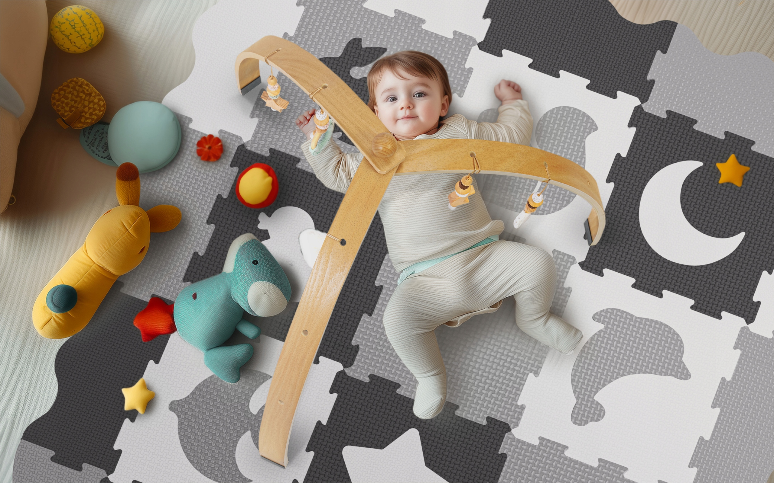 5 різних іграшок створено, щоб надихнути дітей відкривати світ і стимулювати їх уяву. Завдяки можливості розвішувати іграшки як завгодно, ви створите ідеальний простір для гри, який відповідає поточним потребам та інтересам дитини .