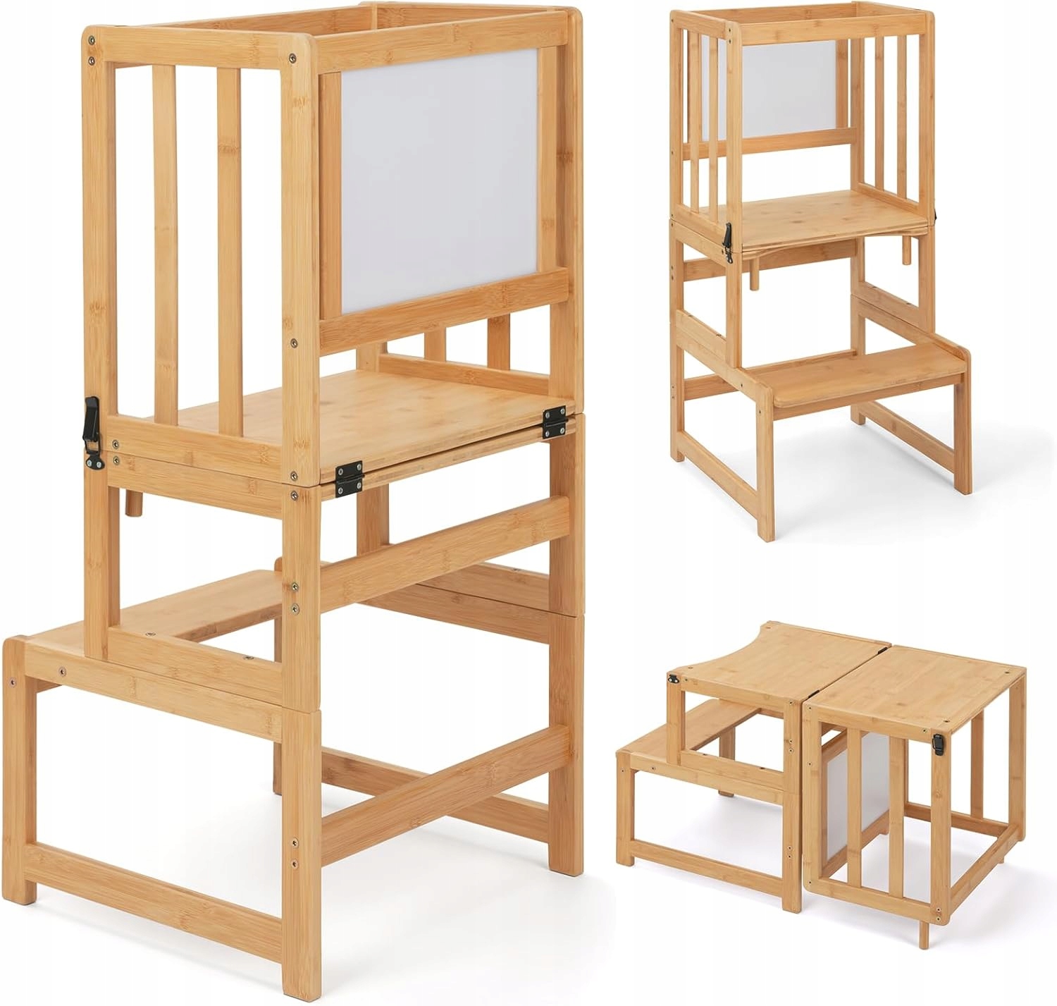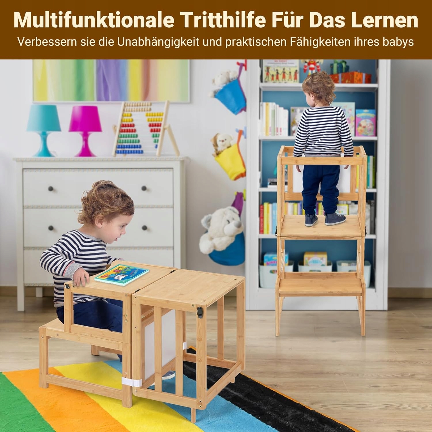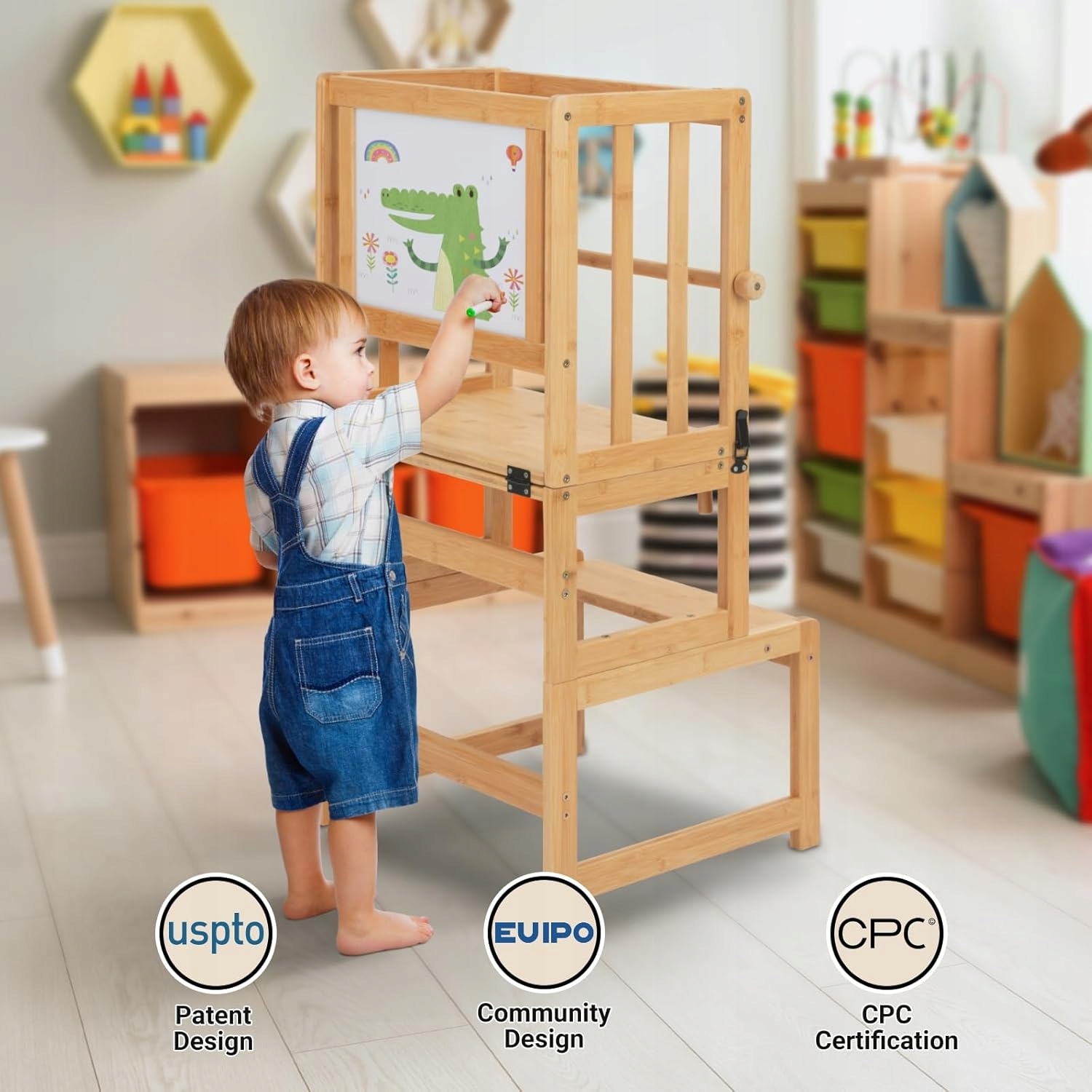 Навчальна вежа 3 в 1: навчальна вежа для малюків — це набагато більше, ніж просто кухонний стілець. Його можна легко перетворити на дитячий столик, який ідеально підходить для навчання, малювання чи інших занять. Крім того, він оснащений дошкою для сухого стирання, яка надає дитині додатковий простір для малювання, гри та розвитку своєї уяви. Завдяки нашій запатентованій конструкції не потрібні інструменти, тому ви можете швидко й легко змінювати функції