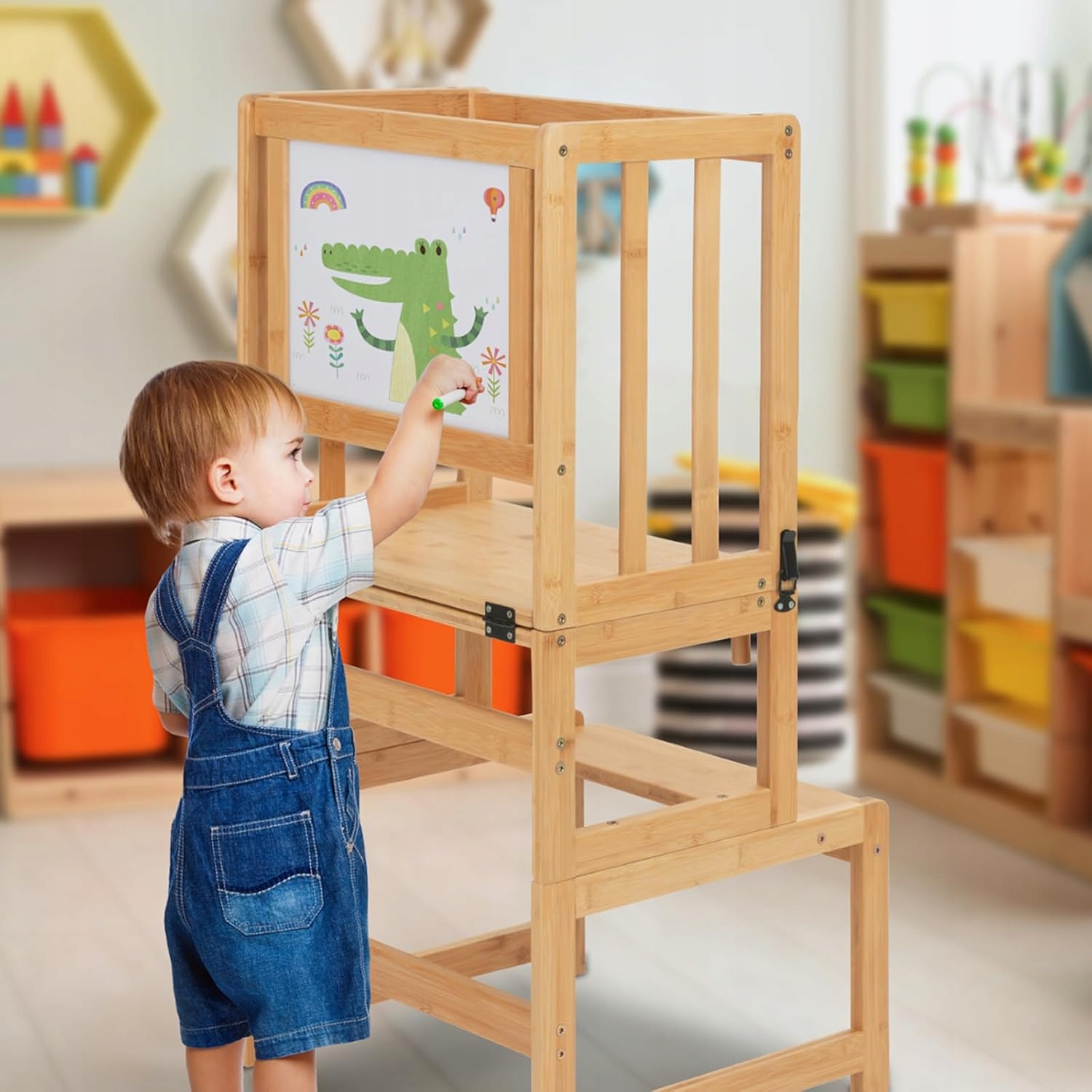 35-дюймова (приблизно 90 см) навчальна вежа 3-в-1 підніме вашу дитину на більшість кухонних стільниць або столиків. Таким чином, він підтримує як незалежність, так і спільний сімейний досвід під час приготування їжі, прання чи чищення зубів у ванній кімнаті
