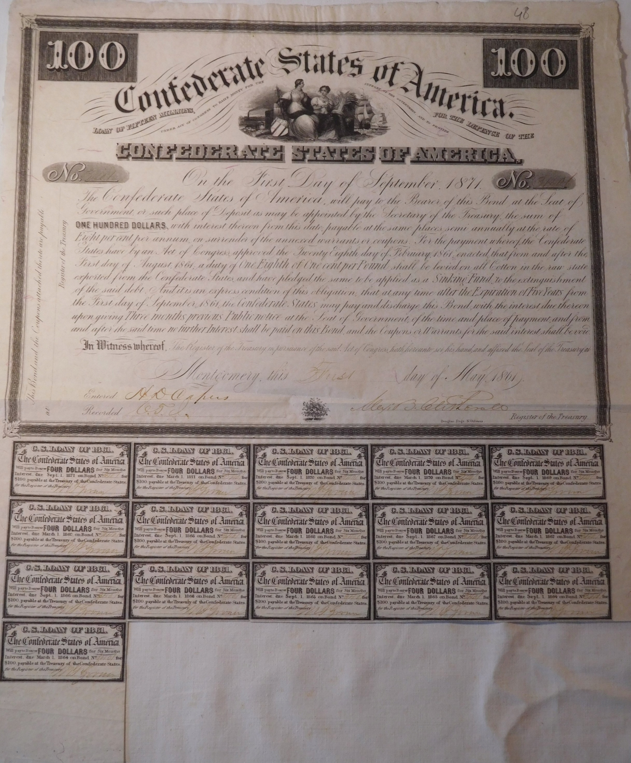 8% Конфедеративна облігація від р. період громадянської війни в США 1861-1865 рр. При відокремленні південні штати діяли як незалежна держава, включно з випуском власних облігацій для цілей війни з Союзом. Декоративні мотиви з віньєткою із зображенням жіночих алегоричних фігур на тлі пароплава та вітрильників. Праворуч у верхньому полі олівцем «33» – номер колекційної одиниці.