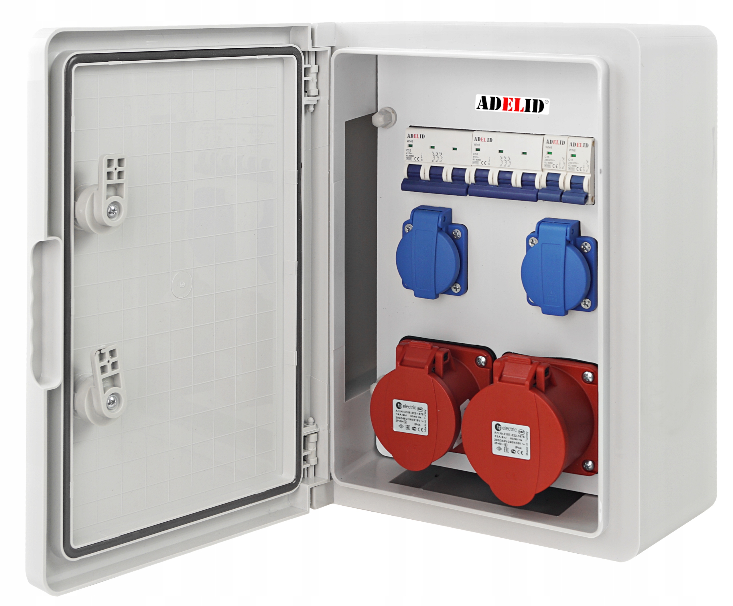 Оригінальний електричний розподільчий пристрій, захищений, марки ADELID, з розетками: 32A, 16A та двома розетками 16A 230V.