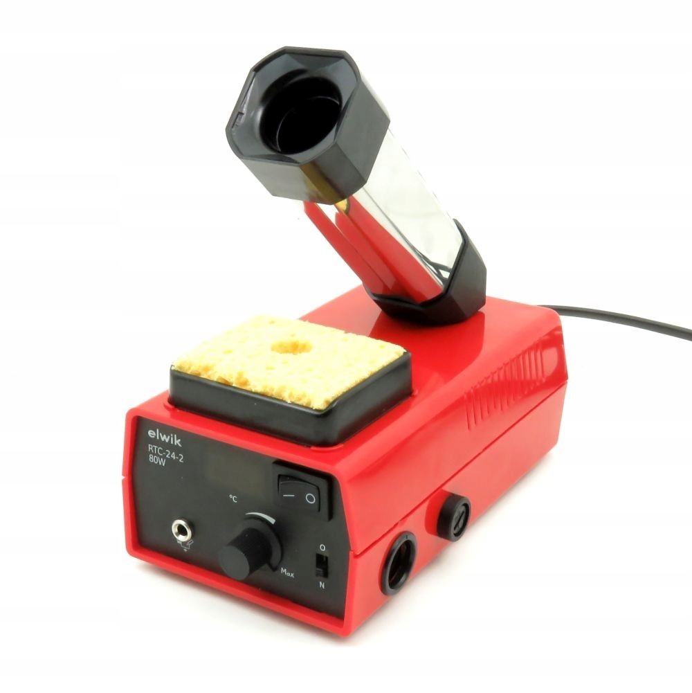 Паяльна станція Elwik RTC-24 з підставкою для паяльника і губкою для чищення. Він оснащений праскою на 80 Вт, яка здатна швидко нагріти жало до очікуваної температури та компенсувати втрати тепла під час пайки. Станція має температурне регулювання в діапазоні 100 - 420°C і цифрове зчитування температури. Дозволяє заземлити наконечник.