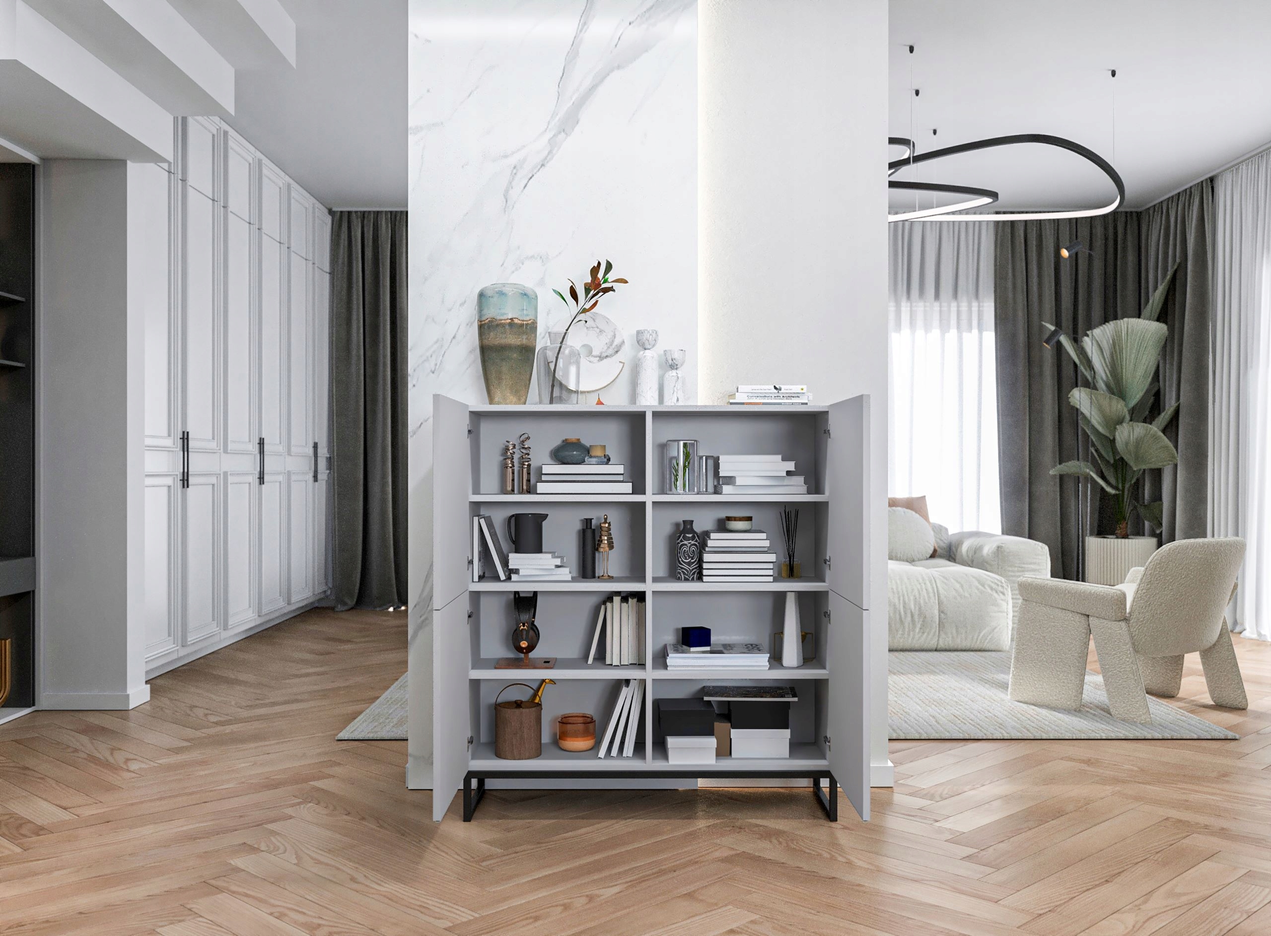 ELPIS у стилі горища додасть унікальну елегантність кожному інтер'єру та надасть своїм користувачам безліч простору для зручного зберігання. Він задовольнить навіть найвибагливіший у своїй функціональності. Система " для відкриття " для відкриття дверей забезпечує естетичний вигляд комода через відсутність видимих ручок. Можна також відрегулювати висоту полиць, що дозволяє адаптувати простір до індивідуальних потреб.