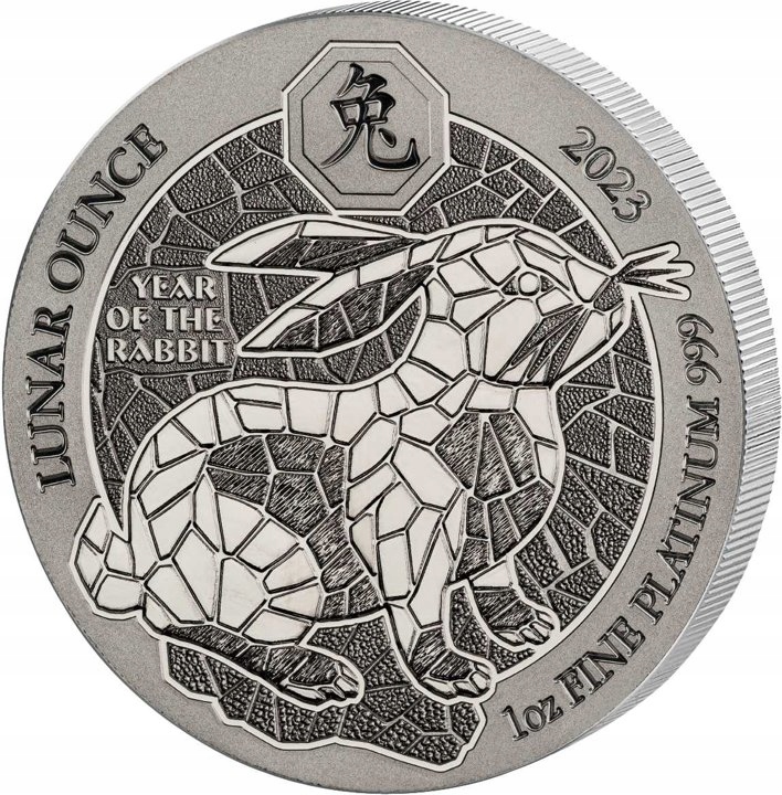 Руанда: Місяць – рік Кролика 1 унція Платина 2023 – це платинова монета в злитках, яка є сьомою монетою в серії Місяць. Руанда: Місяць — це африканська колекція, що містить місячних тварин за китайським календарем. Звичайно, як і в інших місячних колекціях, зображення тварин змінюється щороку. 2023 рік належить кролику, якого ще називають котом. Китайський знак Зодіаку Кролик припадає на 1951, 1963, 1975, 1987, 1999, 2011, 2023 роки.