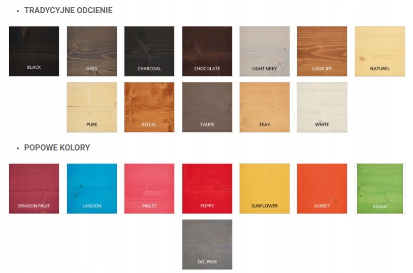 - універсальний: підходить майже для всіх типів деревини всередині та на вулицідоступний у 20 кольорах: 12 стандартних кольорів деревини та 8 модних кольорів POP!