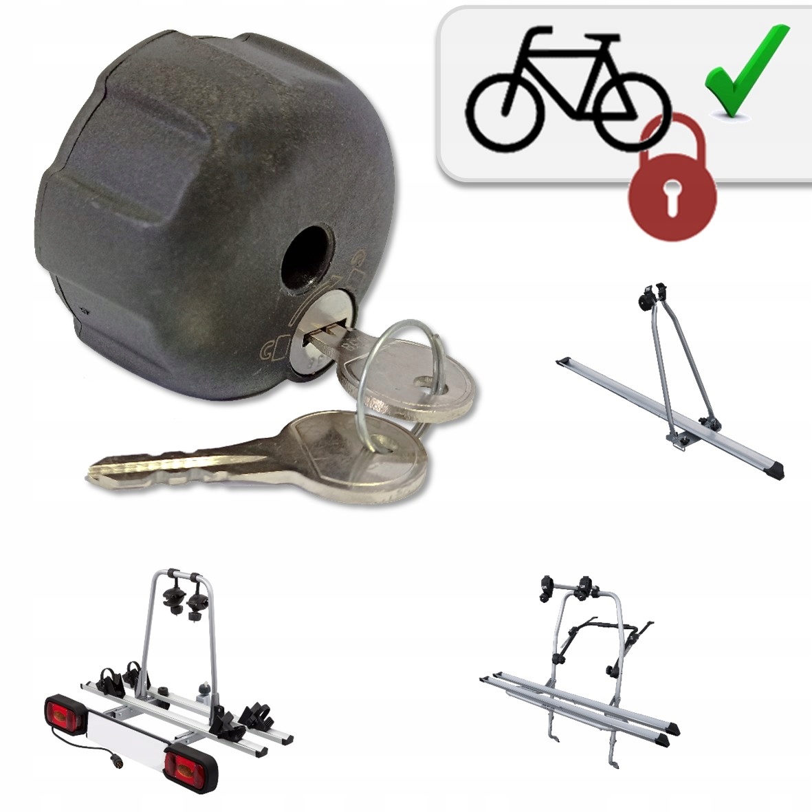 Щоб повністю захистити велосипеди, замініть кожну ручку в багажнику ручкою з ключем. Наприклад, у випадку 3-велосипедних платформ другий і третій велосипеди часто тримаються за одну ручку, оснащену двома ручками. Тому в такій ситуації слід придбати 4 штуки товару.