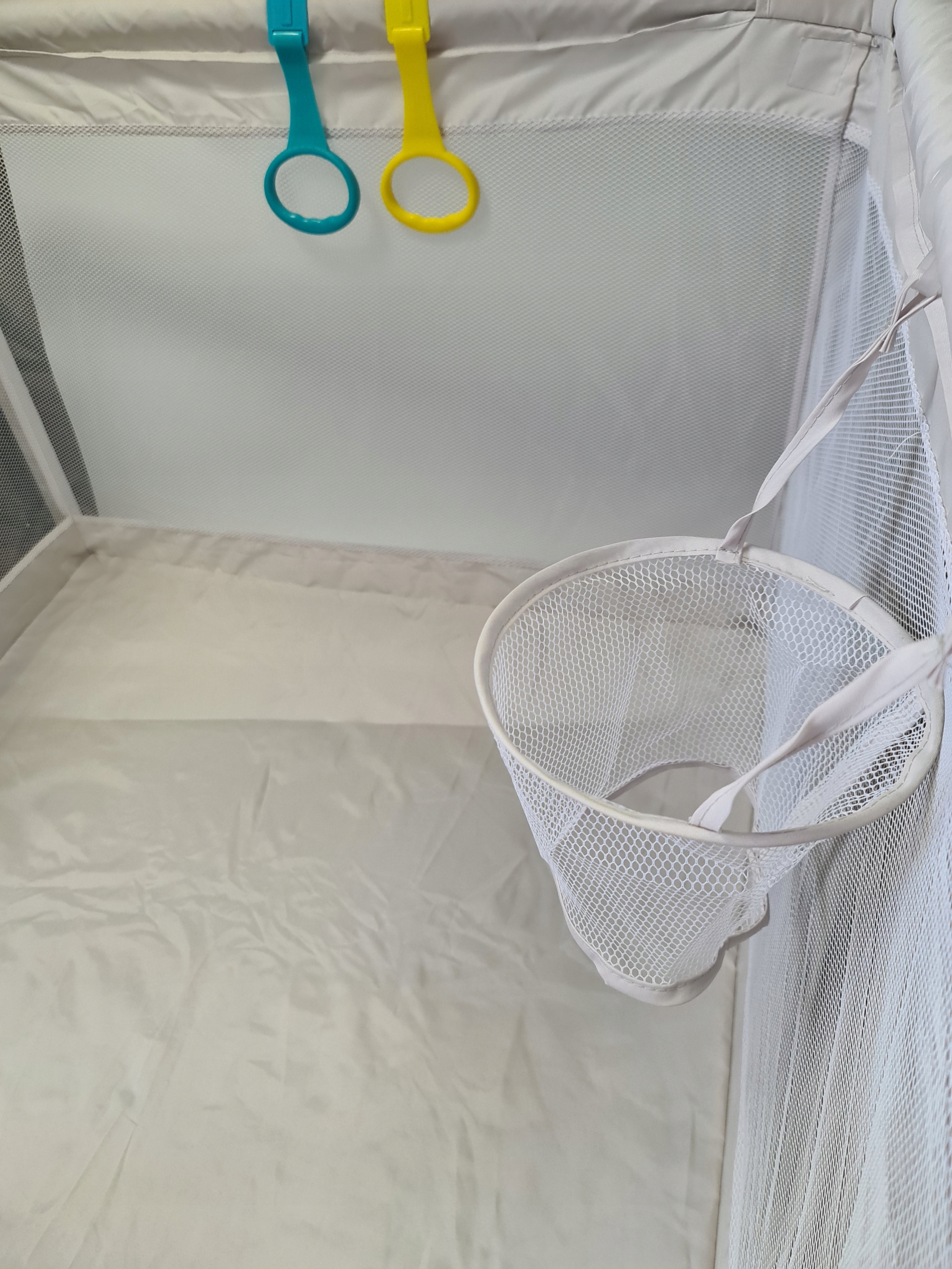 Наш набір також включає спеціальну сумку для транспортування, в якій можна транспортувати манеж, наприклад, під час відпустки, або зберігати складений манеж, наприклад, для іншої дитини. Він також має 4 ручки для навчання вставати, кошик для ігор і кишеню/органайзер, пришитий із зовнішнього боку манежу.