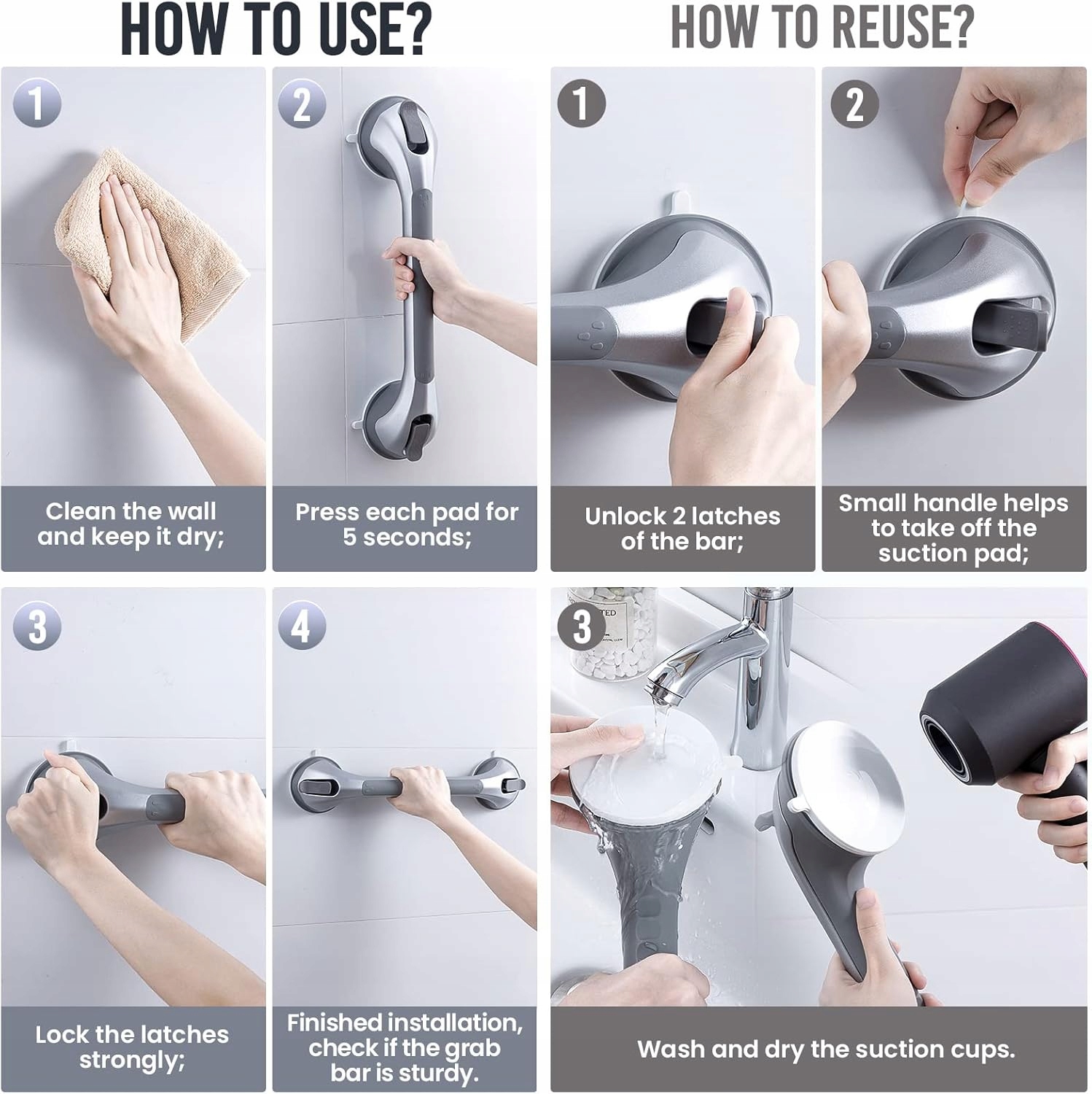 Надміцний - тримач для душу витримує до 113 кг, виготовлений з високоякісного матеріалу ABS, він міцний і запобігає поломці. Без свердління, без клею, без інструментів, стійкий до води та масла. Просто натисніть на присоску протягом 5 секунд. Що довший час адсорбції нашої присоски, то більша поверхня адсорбції та сильніша.