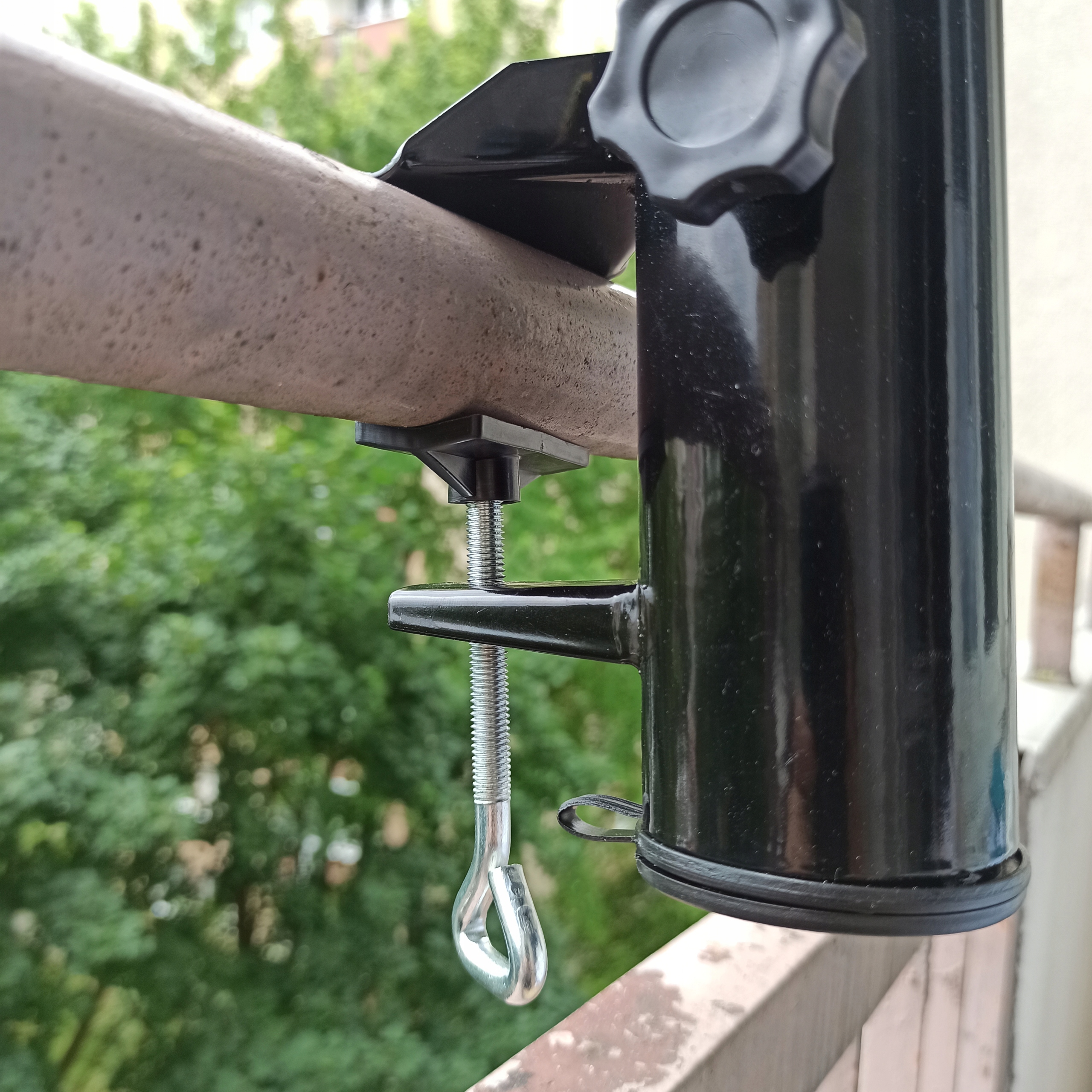Основа - кріплення дозволяє зручно встановити парасольку на труби різного діаметру та на різних типах балюстрад. Це дозволяє розмістити його на терасі, балконі або в інших місцях. Вам більше не потрібна спеціальна основа для кріплення парасольки, просто прикрутіть сталеву основу. Крім того, ви можете розмістити, наприклад, прапор у тримачі, щоб підкреслити будь-яке свято.