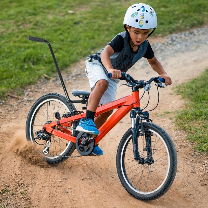 Універсальний посібник для дитячого велосипеда забезпечить безпечне та комфортне навчання вашої дитини їзді. Це неоціненна допомога під час перших моментів, проведених на велосипеді. Дозволяє контролювати траєкторію руху дитини та запобігає небезпечним ситуаціям на дорозі. Дитина весь час залишається під контролем того, хто нею керує, і той, хто нею керує, може в будь-який момент зупинити або направити велосипед у потрібному напрямку. Навіть після від'єднання бічних коліс, направляюча майже необхідна для підтримки рівноваги.