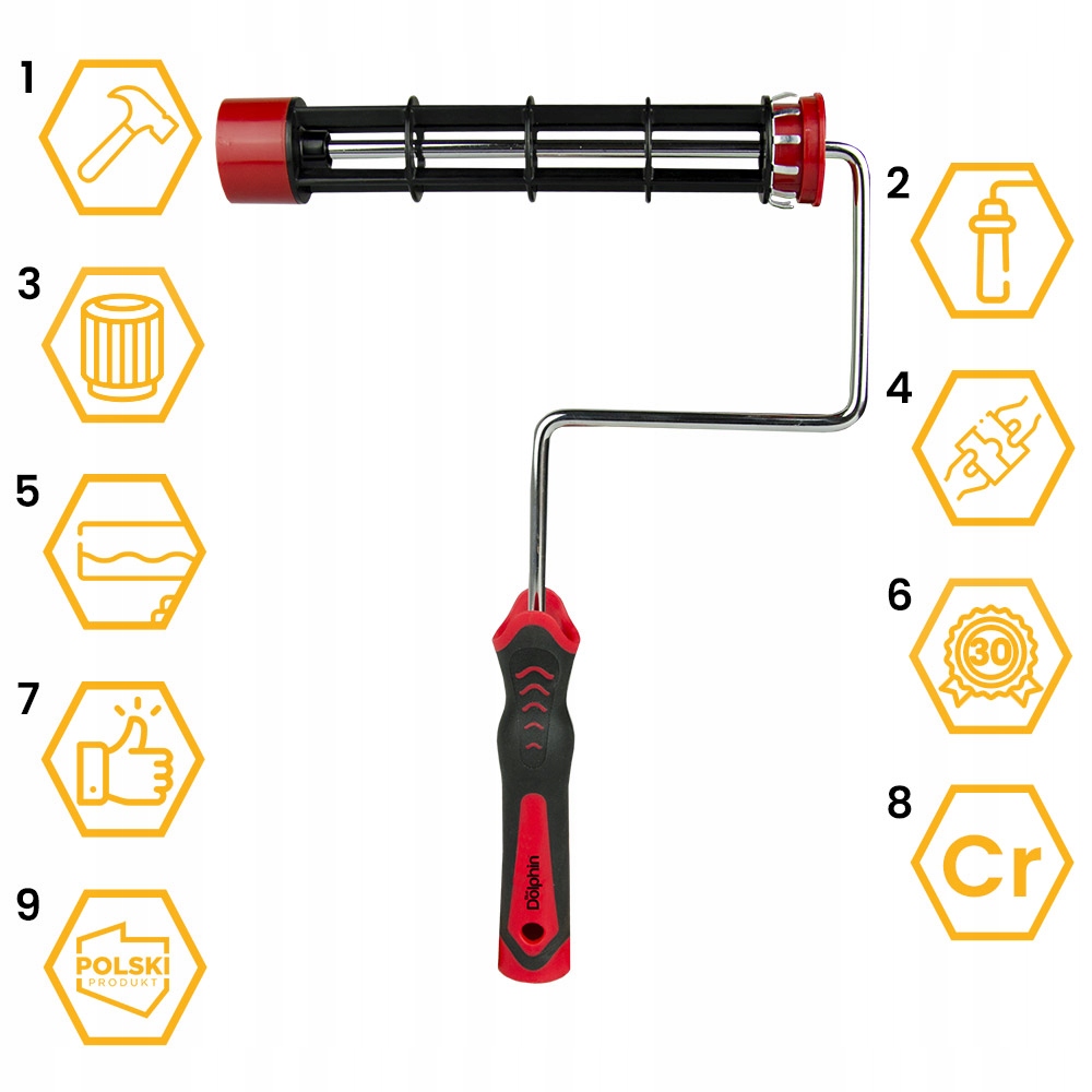 Тримач DolphinRoller для ролика серії 330 від Blue Dolphin - високоякісний продукт. На комфорт і ефективність використання впливає ергономічна двокомпонентна рукоятка і стійкий до механічних пошкоджень посилений нейлоновий циліндр, який має металеву засувку, що запобігає зісковзуванню валика під час фарбування.