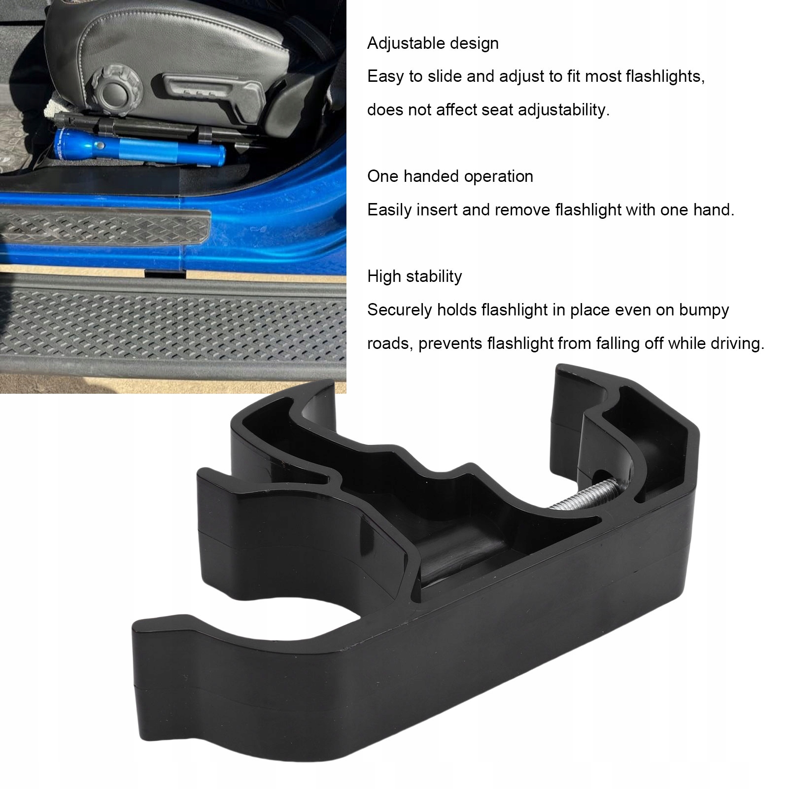 2. Universal Fit: Цей регульований тримач ручки ліхтарика сумісна з більшістю ліхтарика. Просто ковзайте та налаштуйте, щоб відповідати тривалості ліхтарика, в той час як кронштейн не натискає на коригування сидіння.