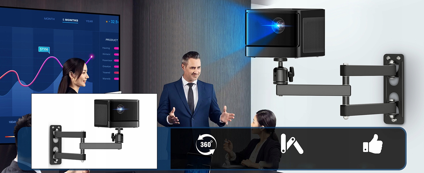 ✔ 360 градусів головка кулі - підставка проектора оснащена високоякісною головкою кулі, яка може обертатися на 360 градусів і нахиляти 90 градусів зліва та праворуч. Завдяки цьому ви можете встановити проектор під будь -яким кутом і отримати надійну, стабільну проекцію під будь -яким кутом, тому ви зможете насолодитися вільним часом.