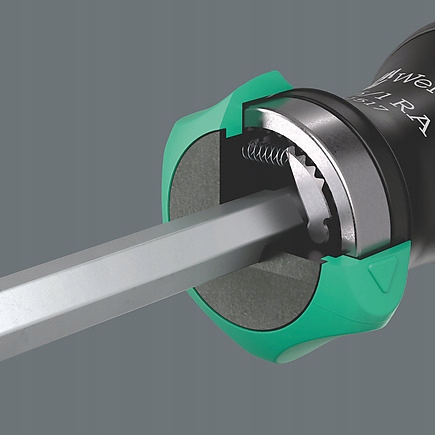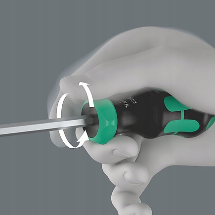 Тріскачка з дрібними зубцями, інтегрована в ручку, забезпечує швидку роботу. Інноваційний храповий механізм дозволяє легко «закручувати», вирішуючи проблеми в ситуаціях, коли гвинт не чинить опір.