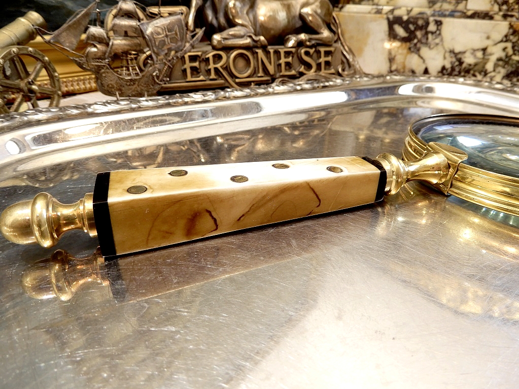 Я запрошую вас придбати гарне збільшувальне скло, збільшувальне скло в латунній оправі, з чудовою кістяною ручкою, усіяною латунними кнопками. Воно дуже наближається, але я не можу точно визначити вартість. Лупа скло створює чудову атмосферу. Ідеально підходить для практичного подарунка. Дрібний шрифт більше не буде проблемою.