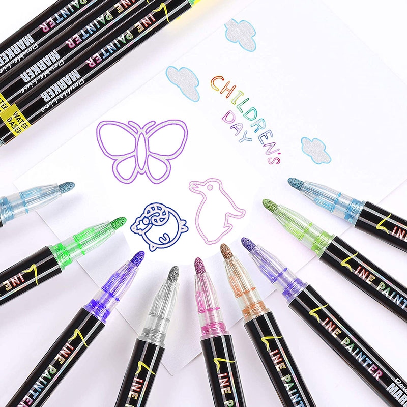 Маркери мають подвійну лінію письма: лінію зі сріблястою внутрішньою частиною та кольорову на папері створюються контури.