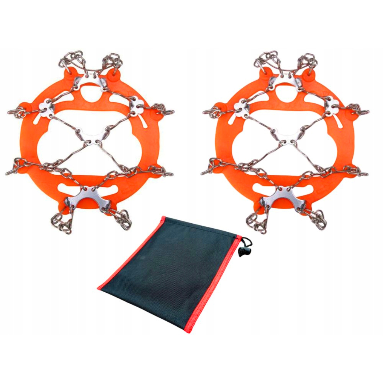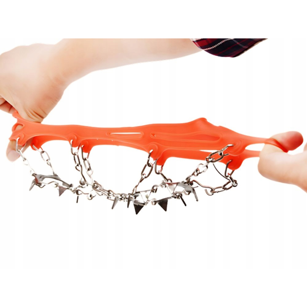 Сталеві зуби на всій підошві з’єднані зі сталевими кільцями та гумовим ободом взуття. Еластична стрічка легко натягується на взуття. Ручки добре прилягають до взуття та не зісковзують.