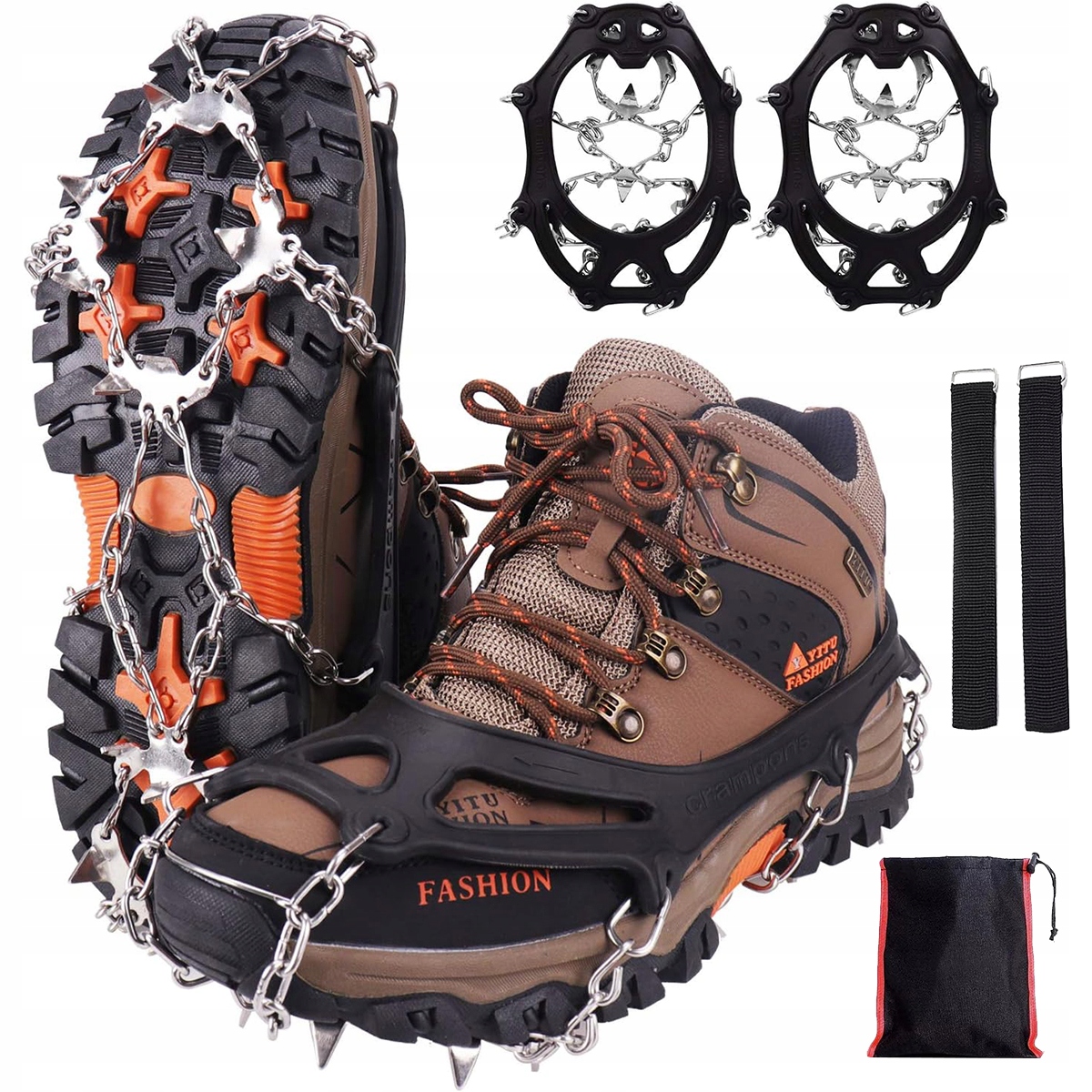 ❄️ЛЕГКІ ТА ПОРТАТИВНІ: кошки легкі, їх легко транспортувати. Їх можна зберігати в невеликій сумці, що додається, або в кишені. Сталеві шипи впиваються в різні типи місцевості, а сталевий ланцюг не дає їм рухатися, забезпечуючи безпеку та запобігаючи травмам. Крампи міцні, не гнуться, забезпечують надійну роботу та здатність лазити. Унікальний ергономічний дизайн гарантує, що ланцюг залишається на місці та надійно утримує ваші ноги, дозволяючи вам вільно ходити.