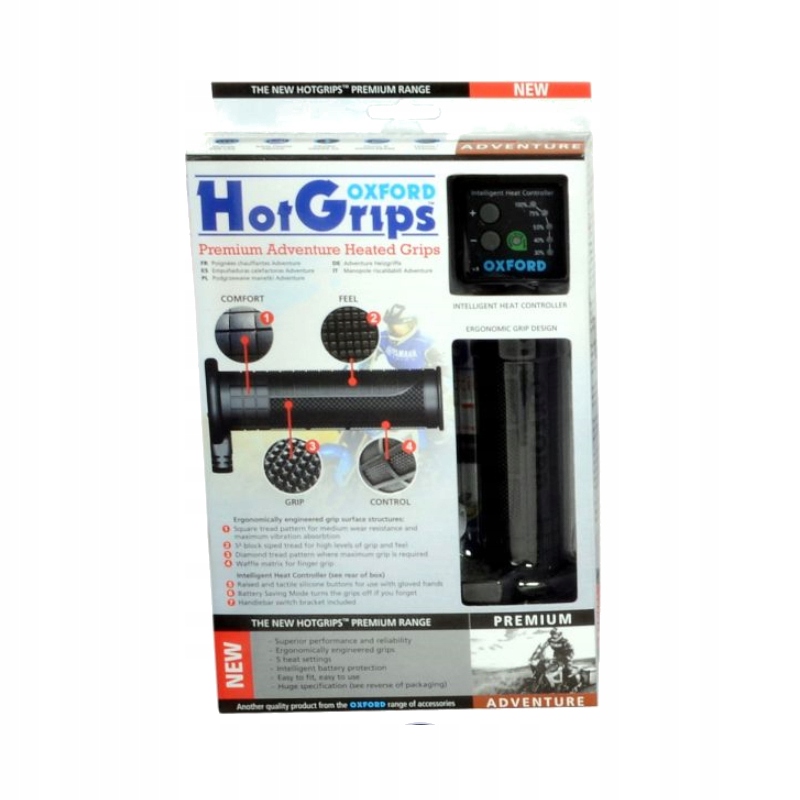 Серія ручок з підігрівом OxFord Premium Adventure для спортивних, туристичних і мотоциклів ендуро з новою панеллю керування V8, що дозволяє точно регулювати температуру нагріву в п’яти ступенях: 30%, 40%, 50% , 75% і 100%. Індивідуальні різновиди були адаптовані до типу та характеристик конкретних типів мотоциклів, а всі функції керування залишаються незмінними. Нова панель управління оснащена опуклими кнопками, що дозволяє виконувати точні операції в мотоциклетних рукавичках. Ручки перемикання передач підходять для мотоциклів з кермом діаметром 22 мм. Виготовлений з монолітного м'якого гумового лиття з вбудованими нагрівальними елементами. Проста збірка з можливістю регулювання шляхом обрізання торців. Текстура важелів спеціально розроблена для забезпечення комфорту під час їзди на окремих типах мотоциклів. Спеціально запрограмований регулятор запобігає повній розрядці батареї під час використання весла в нерухомому стані. У комплекті: два важеля, контролер, регулятор, дроти з запобіжником і клей.