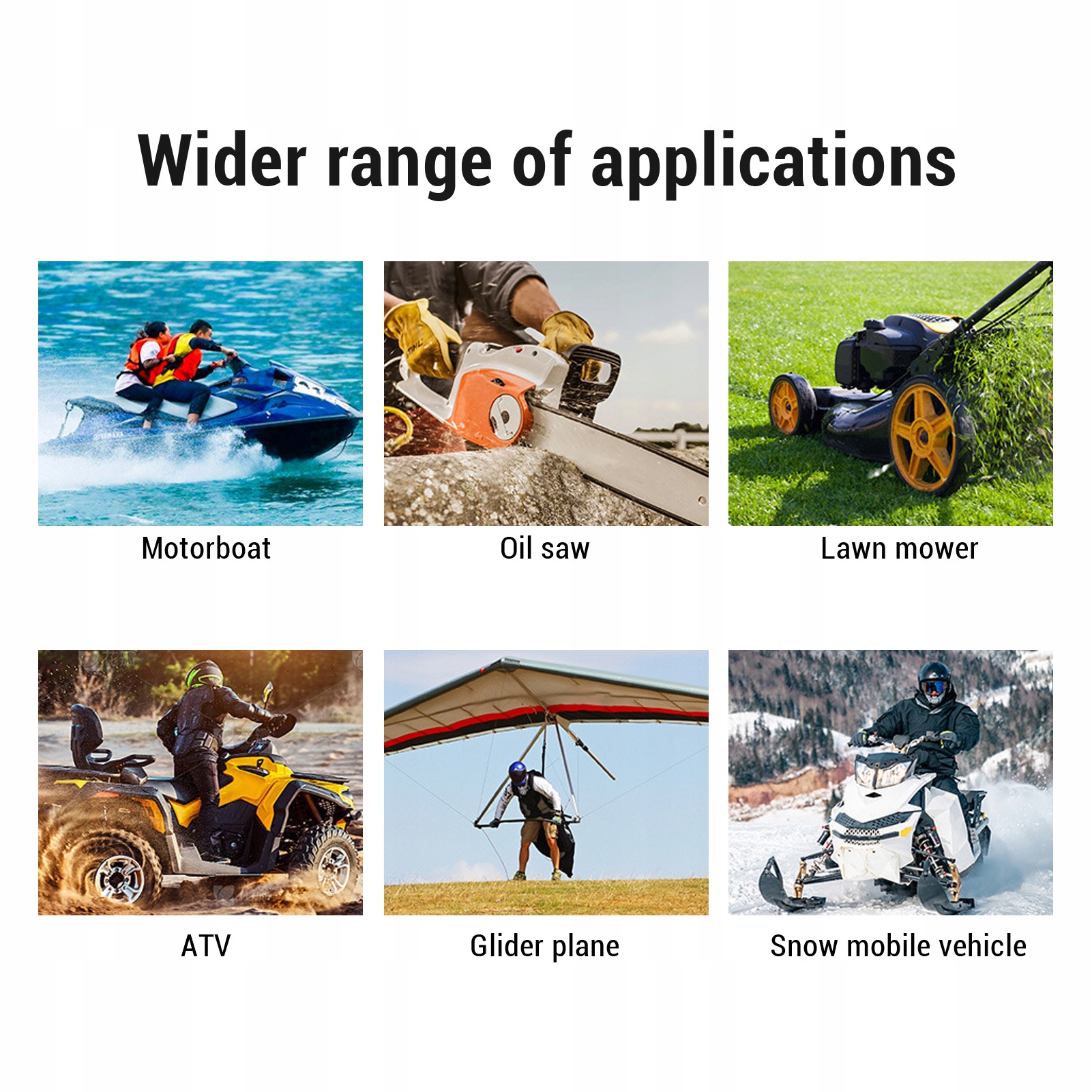 ańcuchowa, хедж-машини, дроблення машин та інші садові машини, сільськогосподарські машини, такі як трансплантація та косарка, шліфувальна машина, машина для різання доріг та інші дорожні машини, мотоцикл, водоростя, картки, ATV та ін.