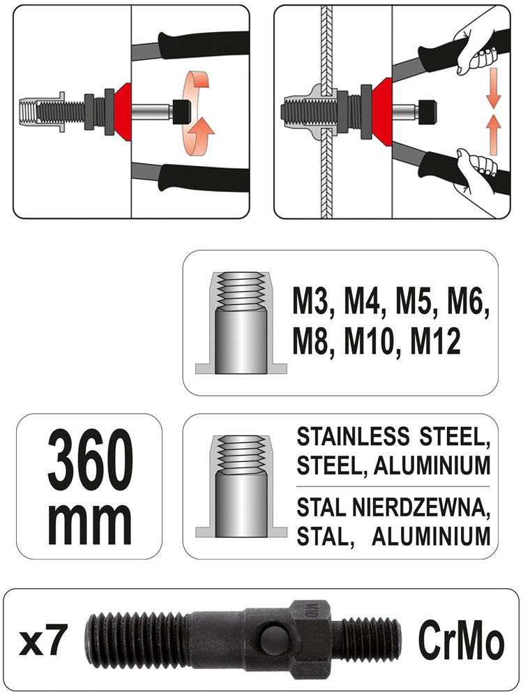 Ручний заклепувальник YATO YT-36128 для заклепувальних гайок M3-M12. Заклепувальний пристрій, призначений для з’єднання матеріалів за допомогою заклепувальних гайок. Виконує з’єднання матеріалів за допомогою втулки з внутрішньою різьбою. Це дозволяє кріпити додаткові елементи металевими шурупами або шурупами. Ручки покриті нековзкою прогумованою підкладкою.