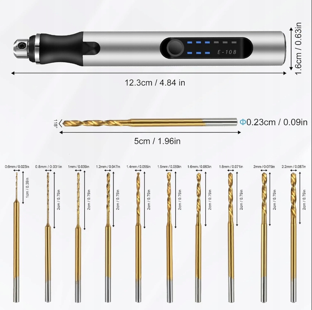 - У набір входить 10 свердел різного діаметру (0,6, 0,8, 1,0, 1,2, 1,4, 1,5, 1,6, 1,8, 2,0 і 2,2 мм), виготовлених з високоякісної швидкорізальної сталі (HSS), яка є надзвичайно твердою. і міцний.