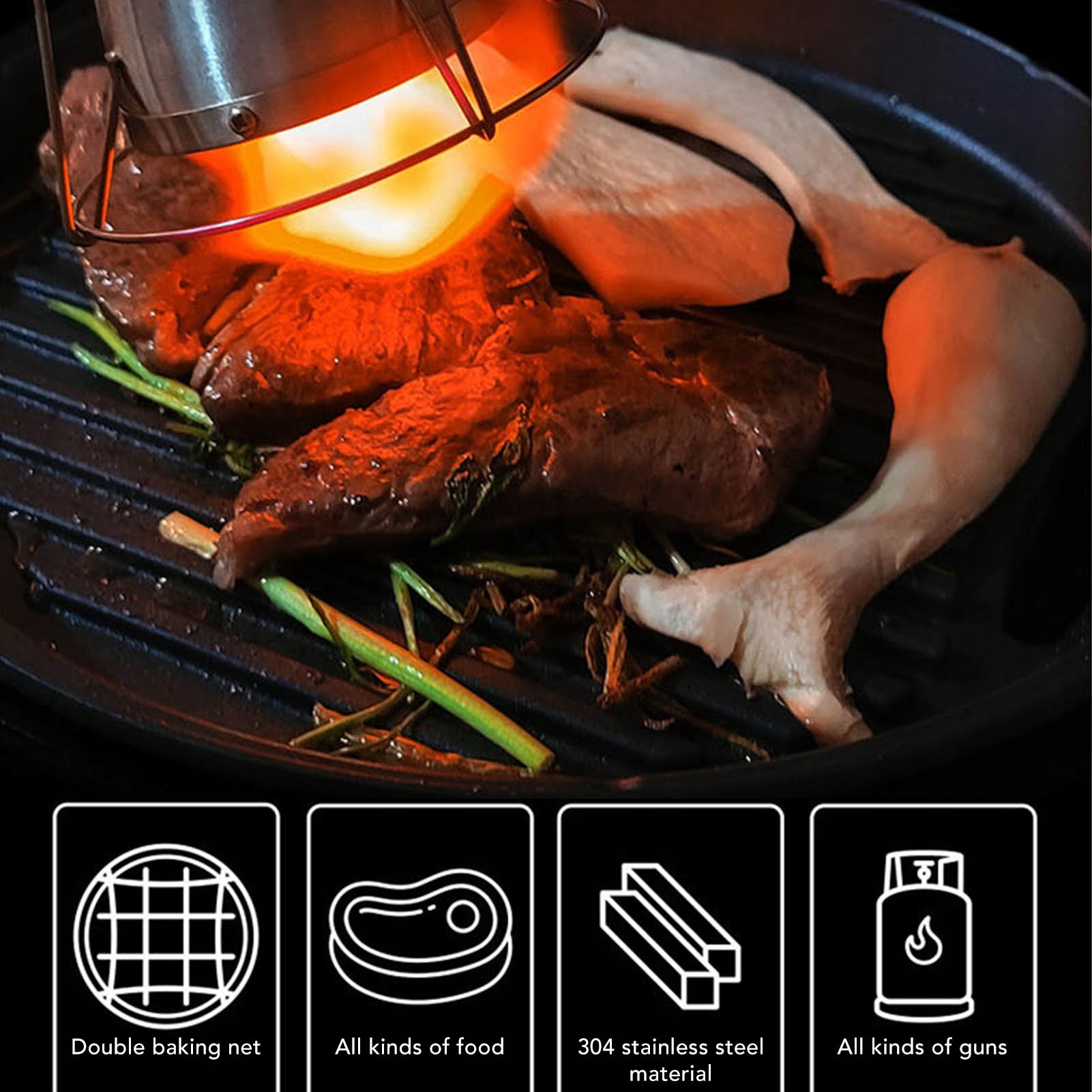 1. Подвійна укладка для випічки: Кулінарне кріплення пальник створює постійне, рівномірно розподілене полум'я через два шари високотемпературної, стійкої до маленької сітки, забезпечуючи професійну обробку м'яса та інших харчових продуктів.