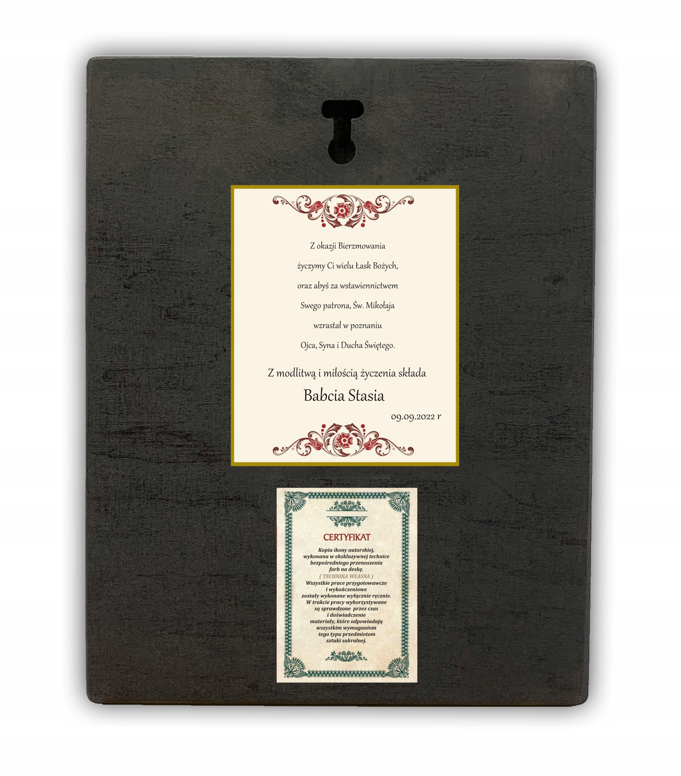 Посвята виготовлена на самоклеючому папері, завдяки чому ікона не жирний і не стирчить зі стіни. Папір закінчується золотою облямівкою. Присвяту на іконі ми ставимо самі. Значною мірою ми зосереджуємося на яскравих і радісних кольорах, щоб відобразити цю щасливу подію: Перше Святе Причастя, Весілля, Хрещення, Миропомазання чи ювілеї.